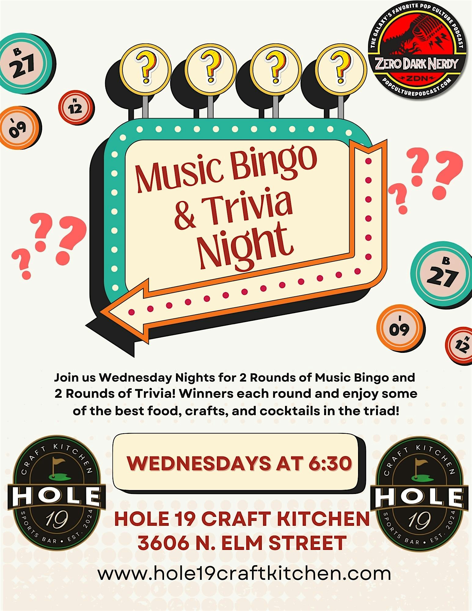 Join us for a fun night of music bingo and trivia at Hole 19 Craft Kitchen and Sports Bar every Wednesday starting at 6:30!