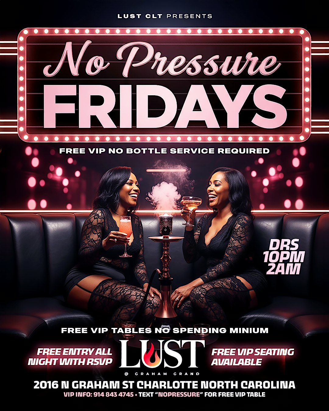 NO PRESSURE FRIDAYS at LUST CLT! $200 Bottles! $5 shots $100 champagne at Lust ultra lounge – Charlotte, NC