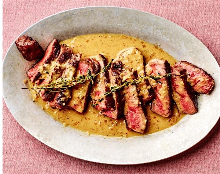 2. For the steak: Heat the butter in the same skillet over medium-high heat. Add the steak and sear to a nice golden brown on both sides, about 4 minutes per side.