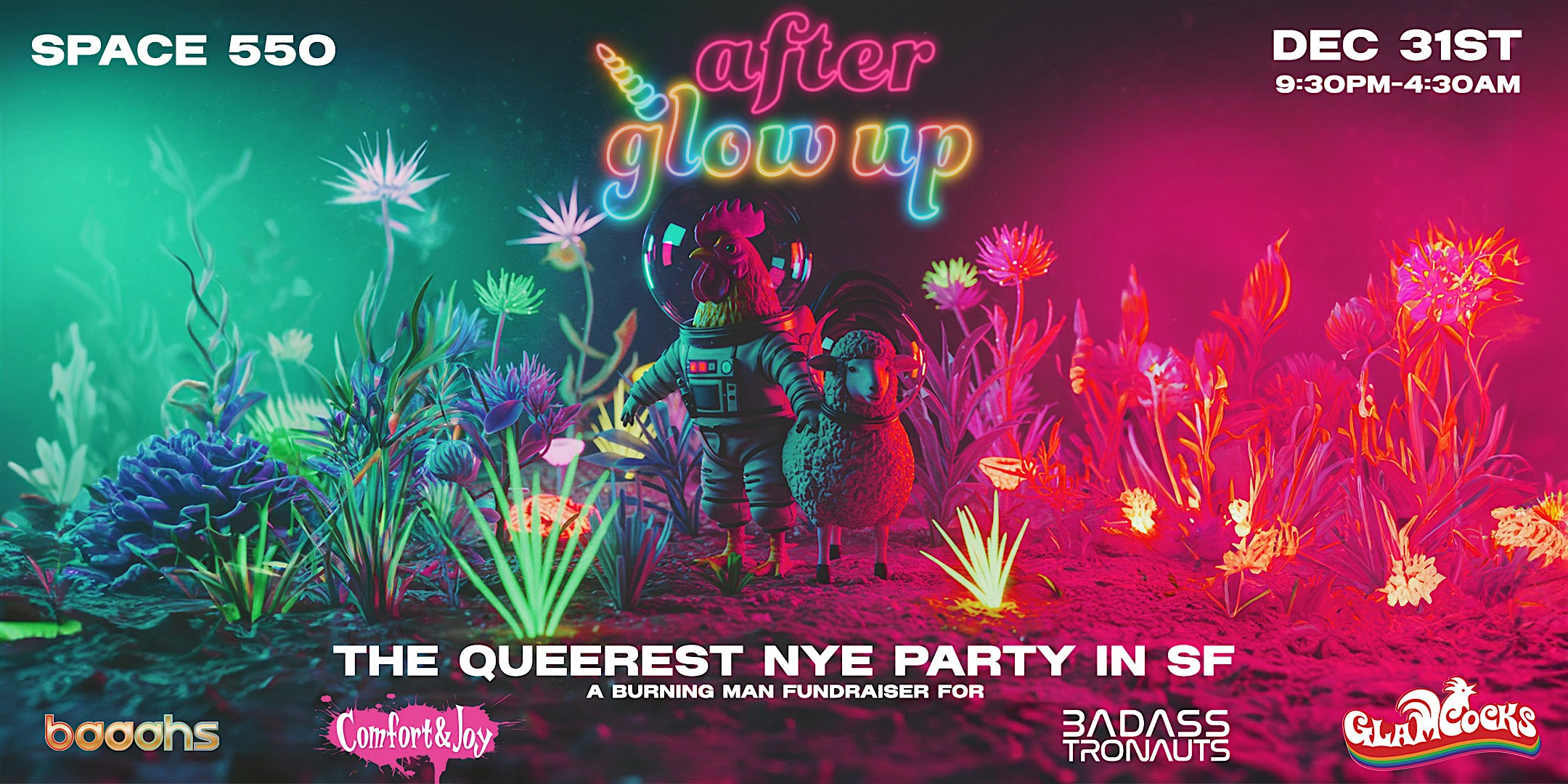 After Glow Up is more than a party, it’s a celebration of queer art, expression, and radical inclusion. Hosted by Burnign Man camps Comfort & Joy, BAAAHS, Bad Asstronauts, and Glamcocks proceeds help us: