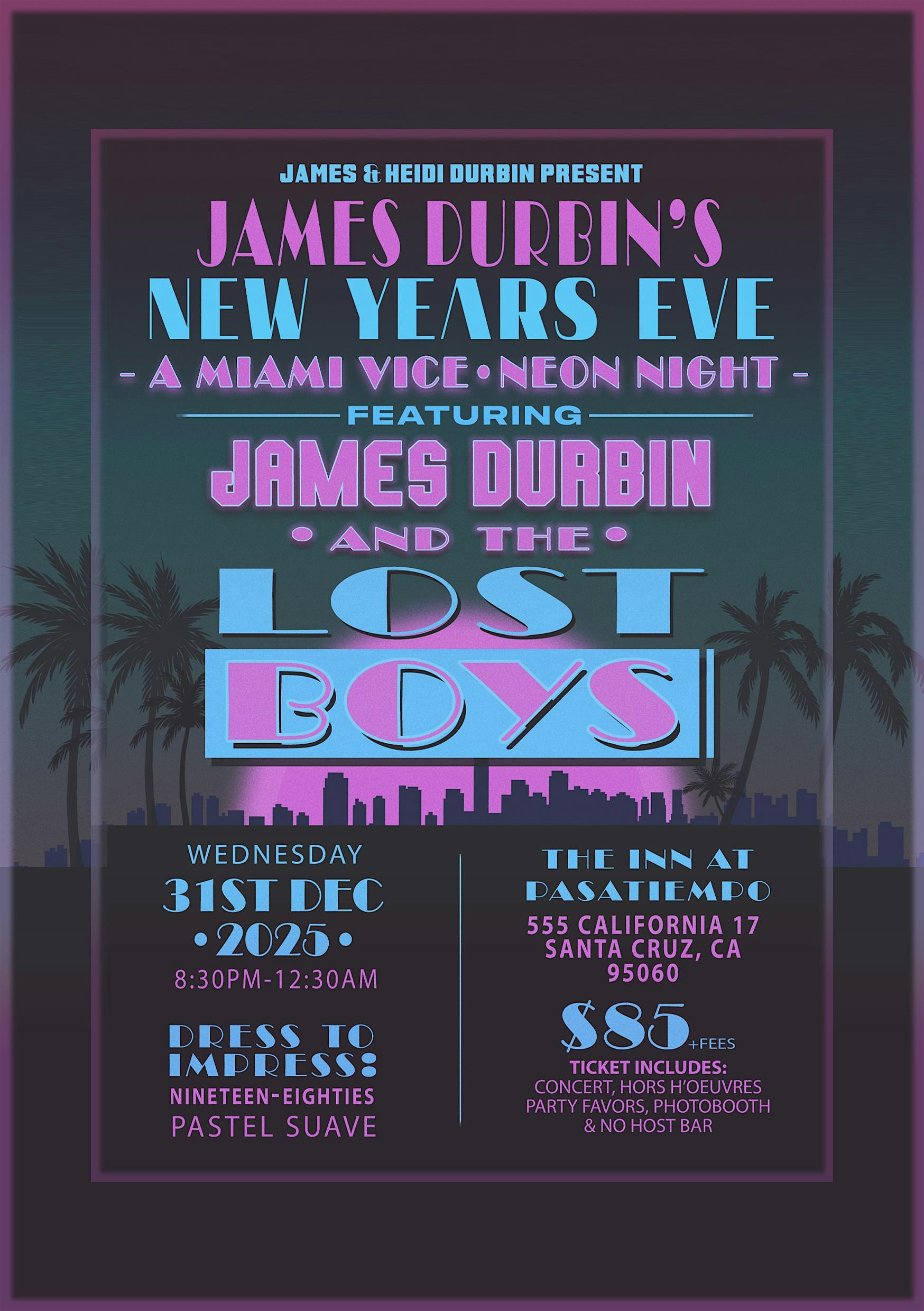 James and Heidi Durbin Present: James Durbin’s NEW YEARS EVE “A Miami Vice Neon Night” with performances by James Durbin & The Lost Boys! Wednesday December 31st, 2025.