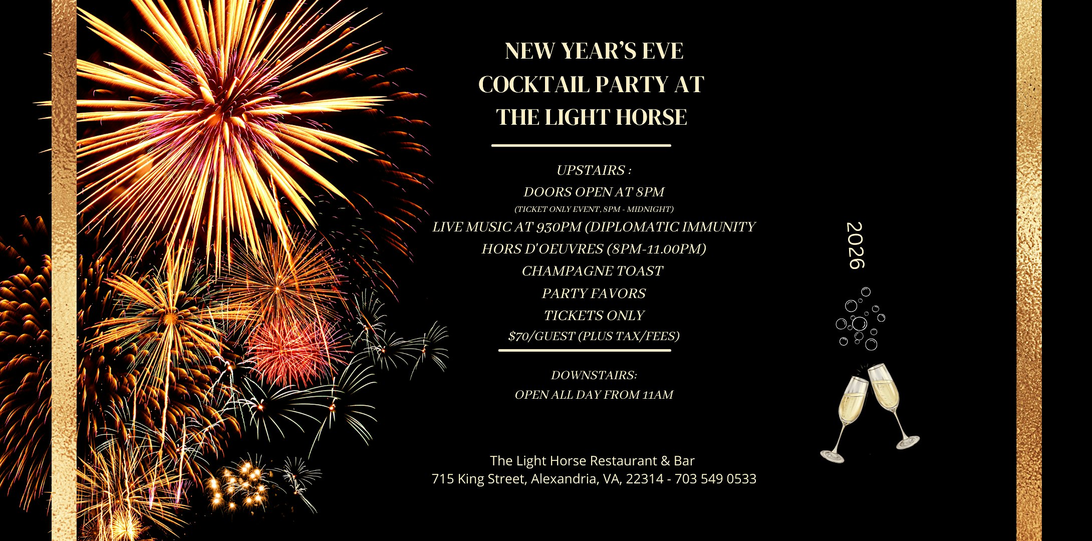 Ring in 2026 with style at The Light Horse’s exclusive New Year’s Eve Cocktail Party! This ticket-only, 21+ event takes place upstairs from 8PM–2AM and features live music by Diplomatic Immunity, setting the stage for a night of song, dancing, and celebration. Enjoy a spread of chef-inspired hors d’oeuvres from 8–11PM, a festive champagne toast at midnight, and plenty of party favors to keep the good vibes flowing.