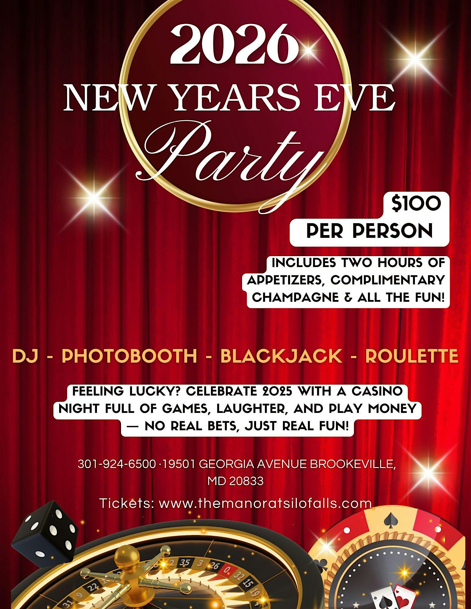 Celebrate New Year’s Eve in style! $100 per person includes complimentary champagne all night, delicious apps, and casino games just for fun