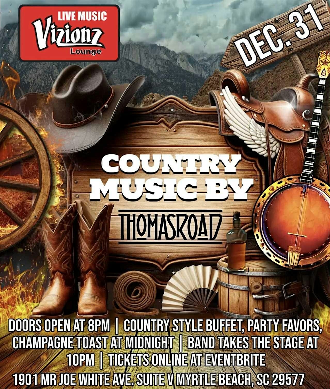 Welcome to the ultimate **New Years Eve** party with **Country Sensation Thomas Road**! Join us for a night of live music, dancing, and unforgettable memories at **Vizionz Lounge and Live Music Bar**. Get ready to kick off the new year in style with Thomas Road’s chart-topping hits and high-energy performance. Don’t miss out on this one-of-a-kind event to ring in the new year with friends, good vibes, and great music. Grab your tickets now and get ready to celebrate! Ticket pricing includes country buffet starting at 8pm, party favors, and champagne toast at midnight!!