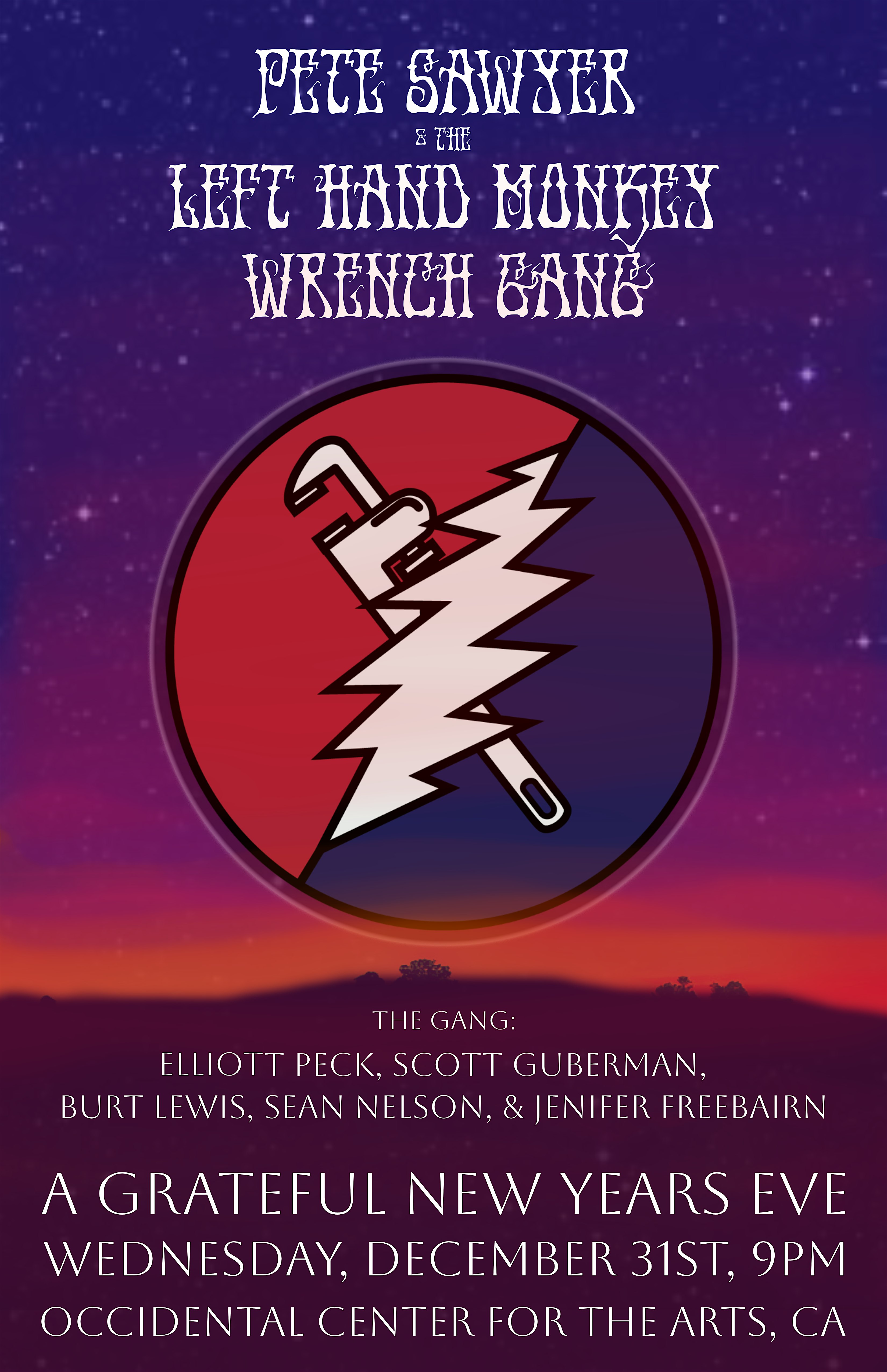 Join us for the best New Year’s Eve party in West County! Pete Sawyer and the Left Hand Monkey Wrench Gang will take us on a joyous ride of Grateful Dead songs performed by his “Gang” of Bay Area stars including: