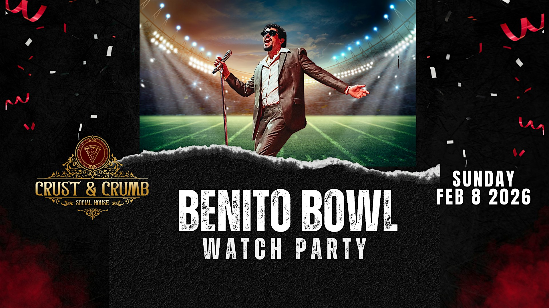 Join us at Crust & Crumb Social House for the ultimate Super Bowl watch party — where football meets Latin vibes, great food, and nonstop energy.