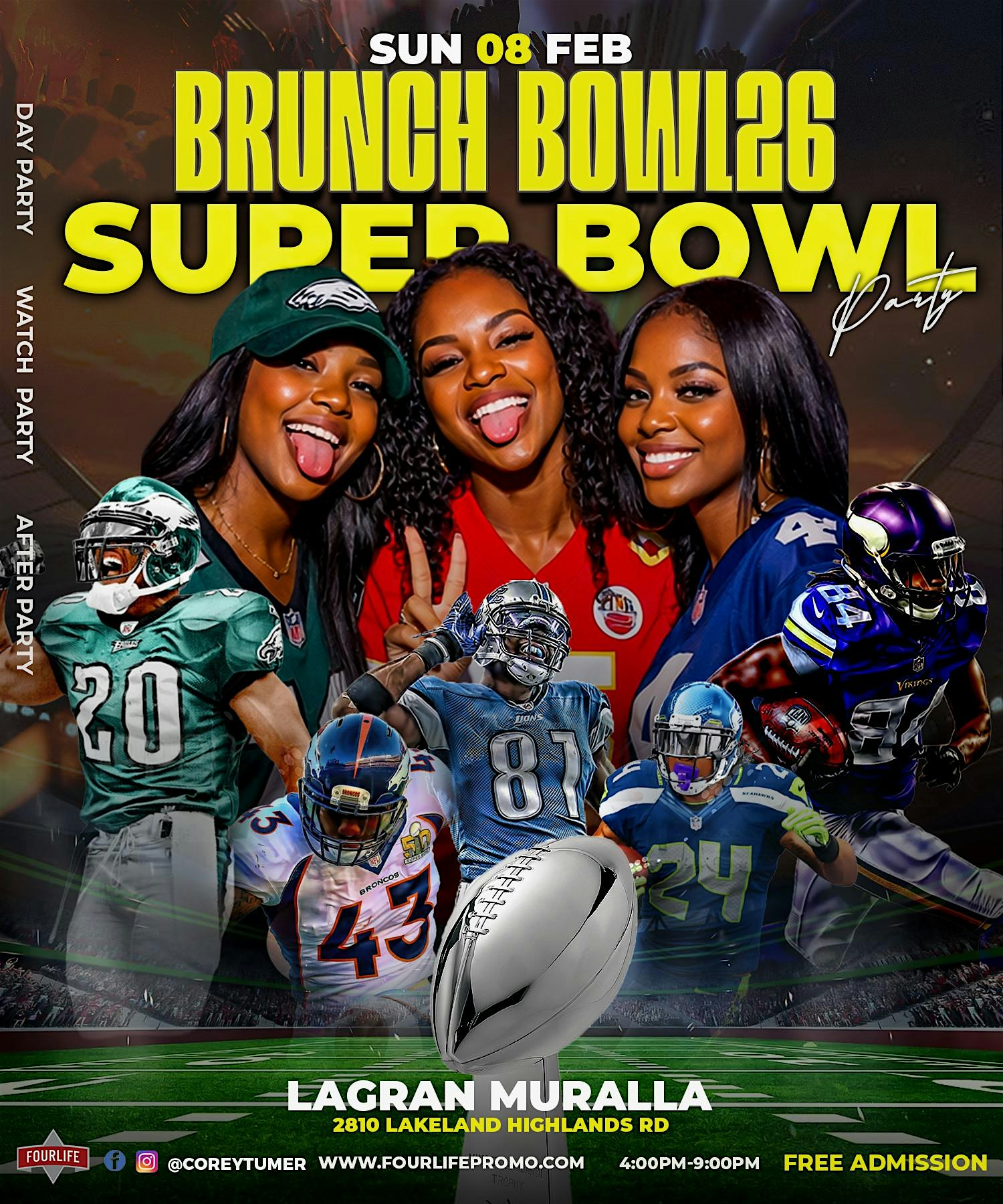 Join Fourlife Promotions for Brunch Bowl The Super Bowl Winners Party Sunday, Feb 8th at Lagran Muralla 28`10 Lakeland Highlands Rd. Lakeland Florida.
