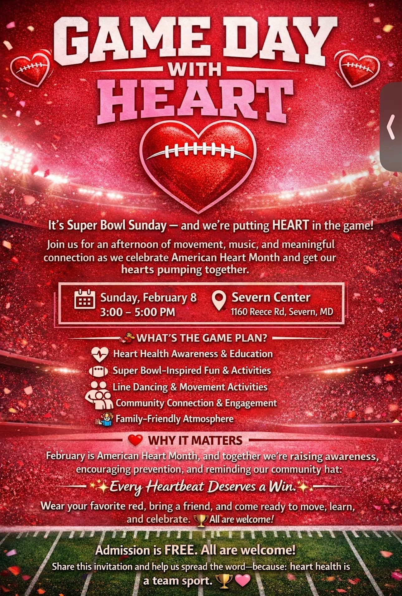 Celebrate Super Bowl Sunday with heart! ❤️ Join us for movement, music, and heart health fun in honor of American Heart Month. FREE!