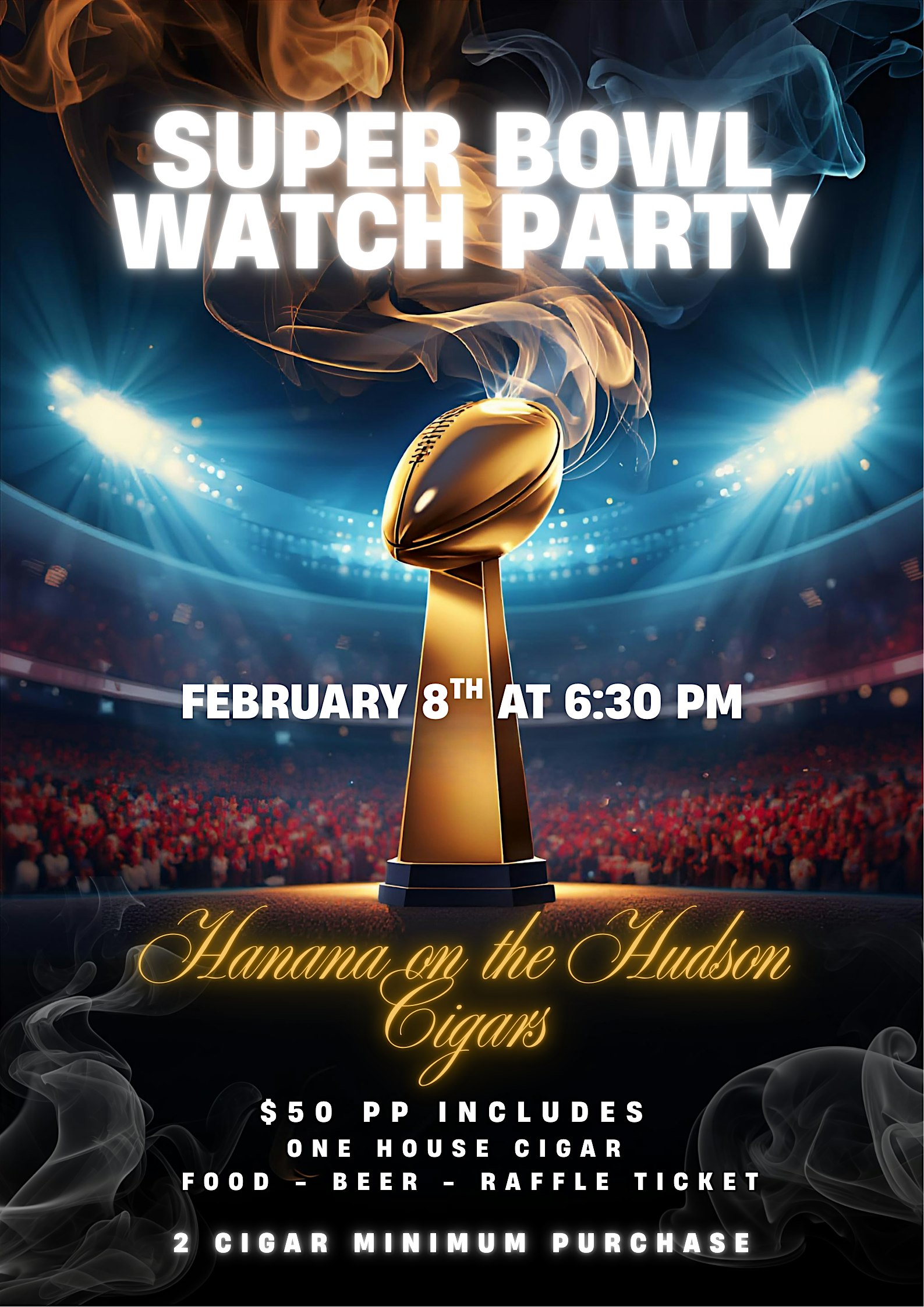 Welcome to the Havana on the Hudson Super Bowl Watch Party – Football & Cigars at Havana On the Hudson Cigars! Get ready for a night of football, cigars, and good vibes on February 8, 2026 at 6:30 PM (Eastern Time). Join us for an unforgettable experience as we watch the big game together. Whether you’re a football fanatic or just here for the cigars, this event is perfect for everyone. Don’t miss out on the fun – mark your calendars and invite your friends!