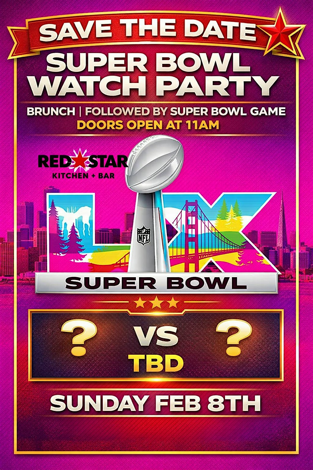 Welcome to the Save the Date Super Bowl Watch Party! Join us at Red Star Matteson on February 8, 2026 at 11:00 AM (Central Time) for a fun-filled event. Get ready to cheer on your favorite team, and watch the big game on the big screen. Don’t miss out on this exciting opportunity to celebrate with friends and fellow football fans. Mark your calendars and spread the word!