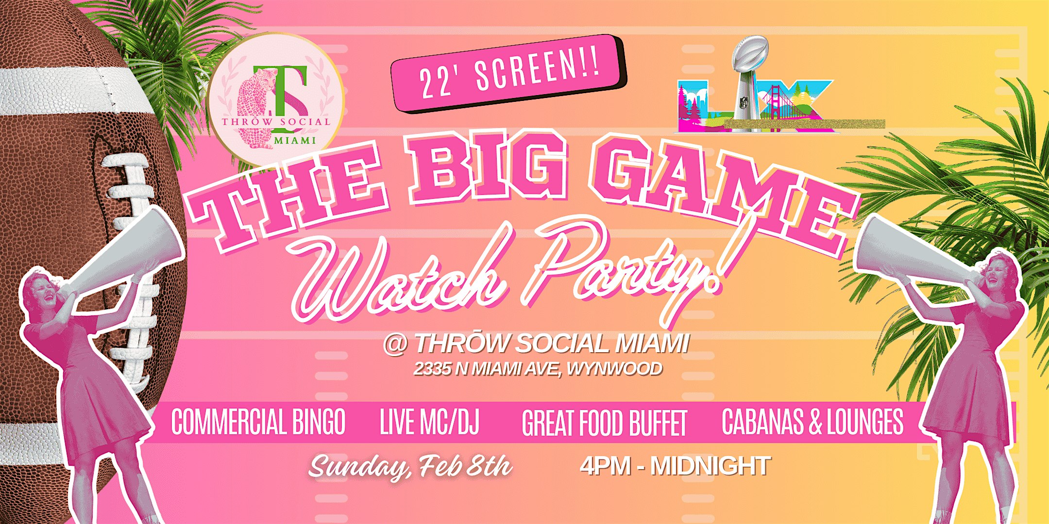 Super Bowl Sunday at the NEW Gorgeous THROW SOCIAL in Wynwood, Miami! 22FT Big Screen, Full Buffet, Commercial Bingo + Prizes, VIP Seating!