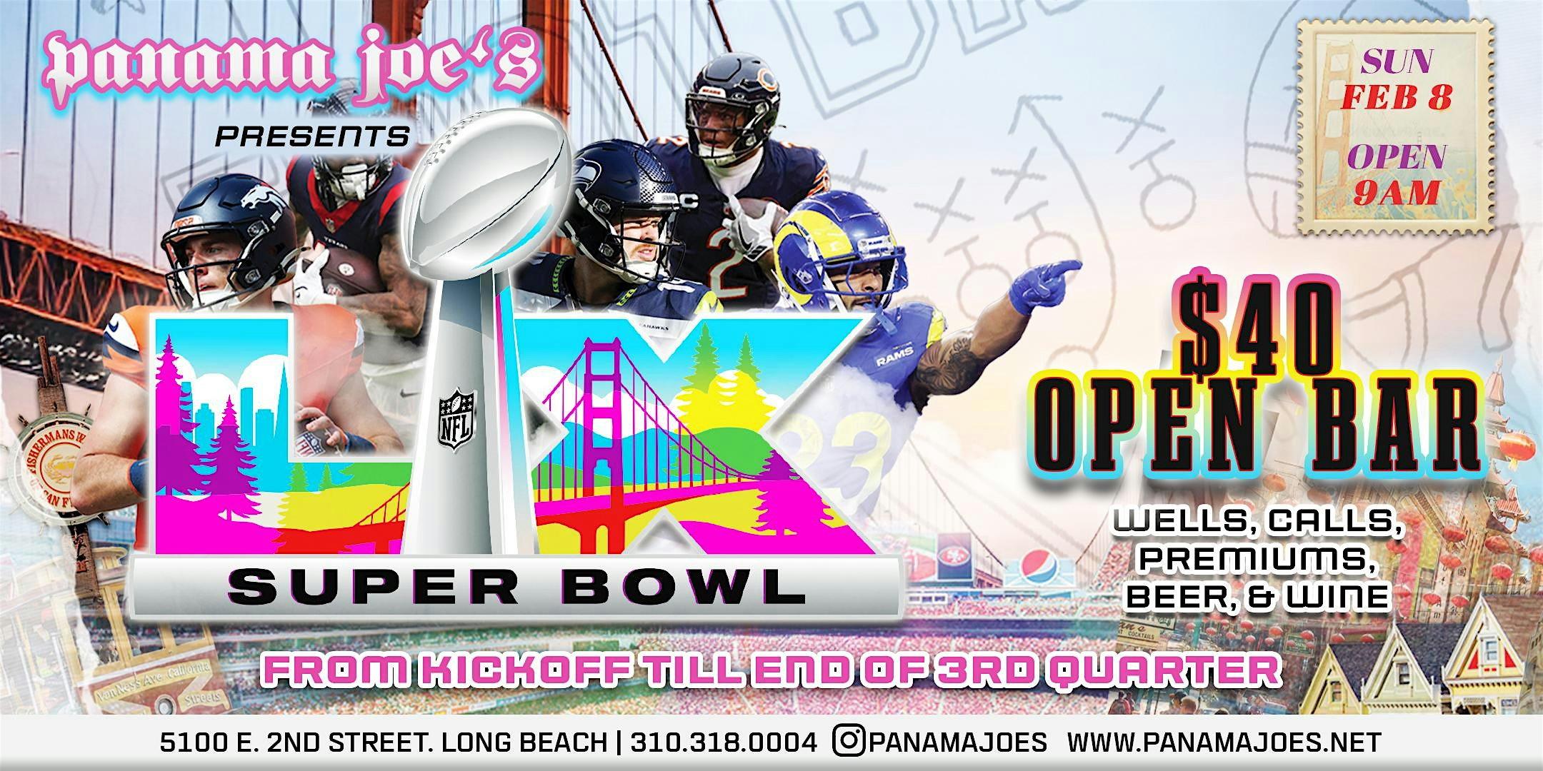 What better way to kickstart the best game of the year but by kickin’ it with your friends over at Panama Joe’s! Come watch the big game with us with an extensive $40 O P E N B A R.