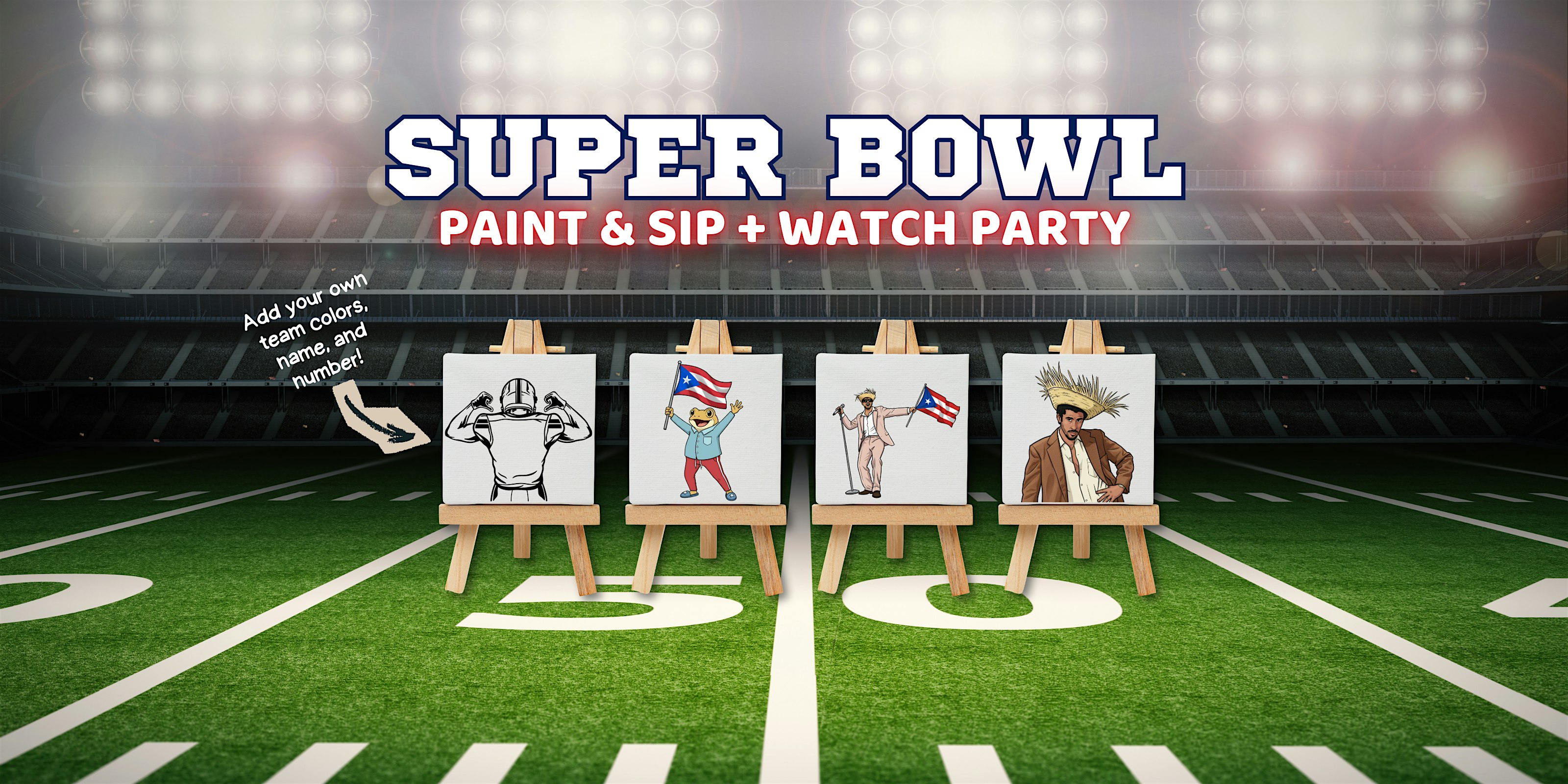 Pre-lined canvas: paint your favorite football team, Bad Bunny or El Sapo Concho with ease and at your own leisure. Perfect for beginners or a great foundation for advanced artists! Includes one themed drink.