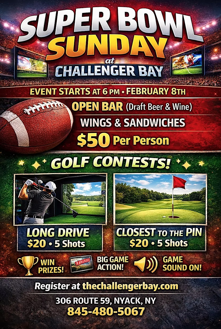 Super Bowl Challenger Bay Style at Challenger Bay Indoor Golf & Sports Bar – Nyack, NY