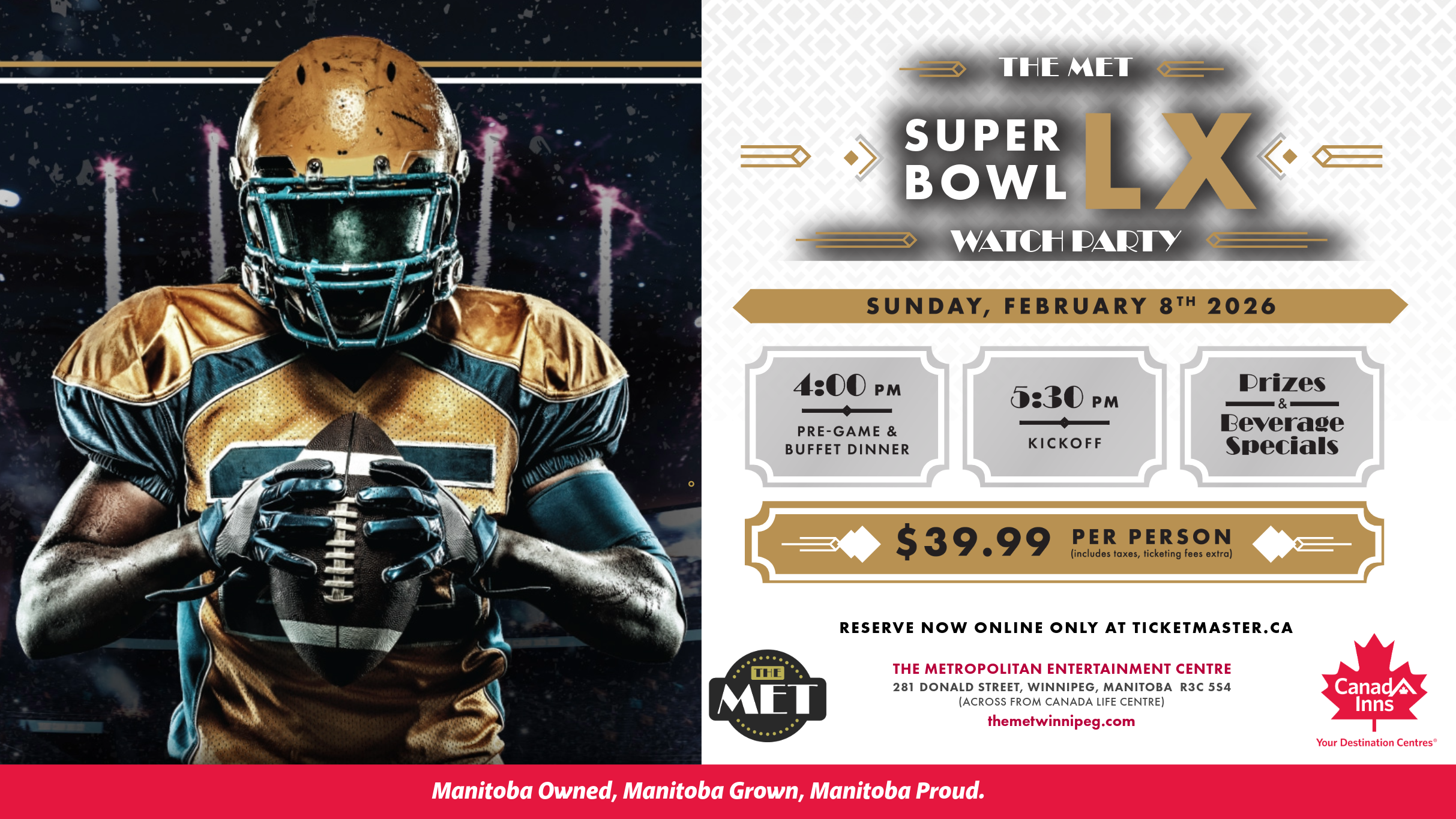 See Super Bowl LX – Watch Party – The MET Live in Winnipeg on Sunday, February 8, 2026, Doors Open at 4:00 PM