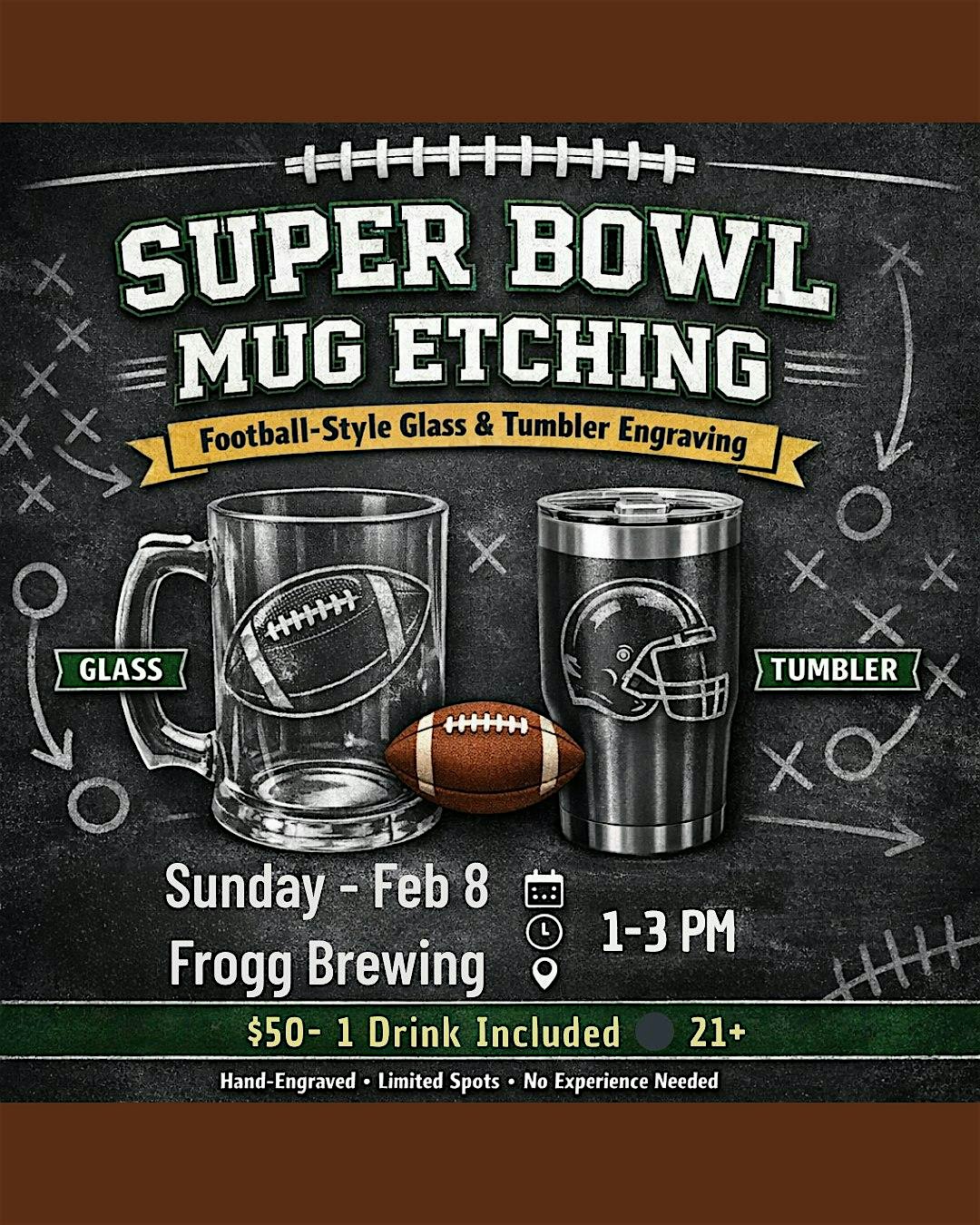 Join us at Frogg Brewing for a 21+ Super Bowl craft night where you’ll hand-engrave your own drinkware using a rotary etching tool. Choose between a glass beer mug or a metal tumbler/ flask and create a custom piece you’ll be using all game long.