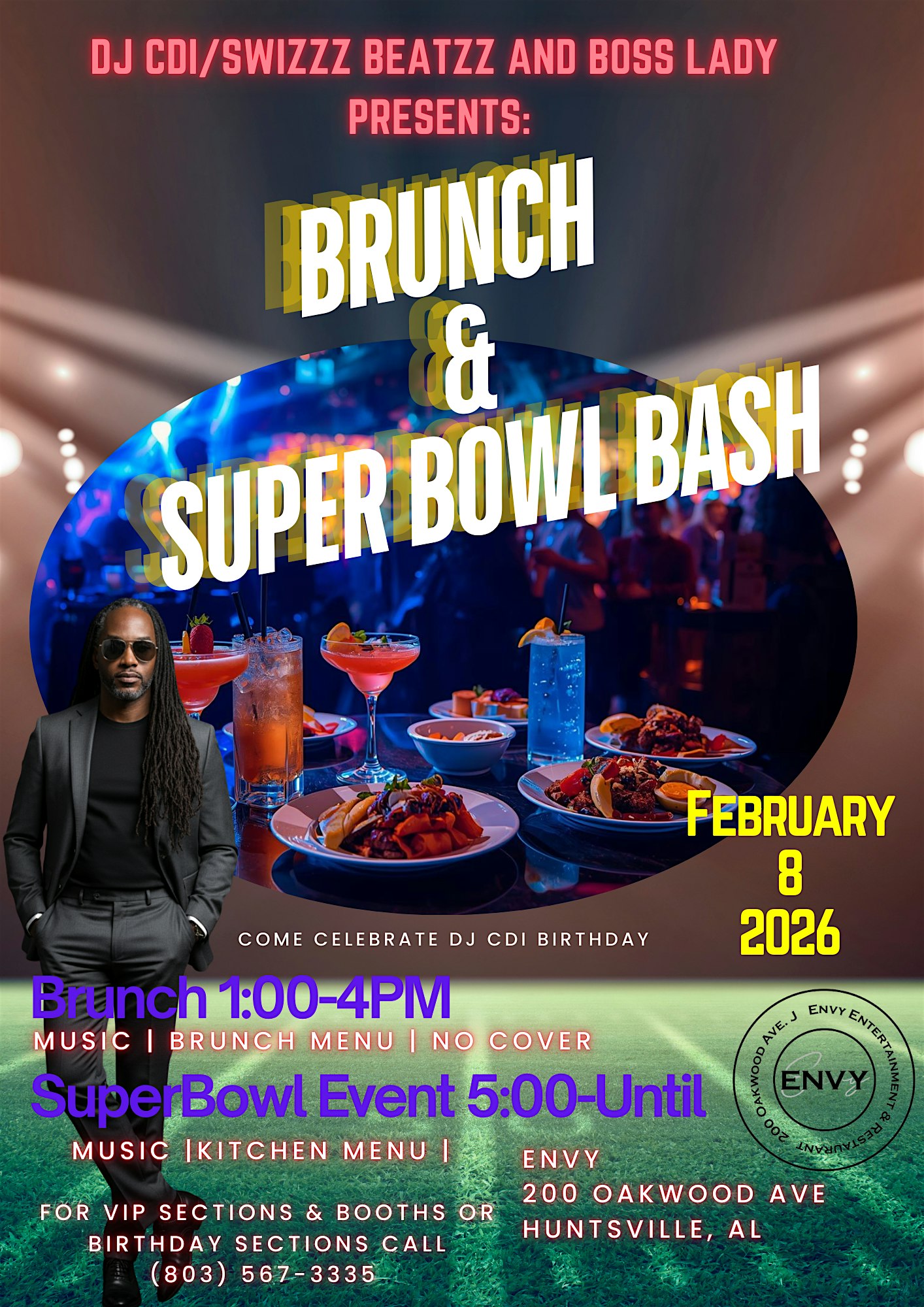 Huntsville Grown and Sexy Crowd, get ready to enjoy brunch from 1-4PM. No cover/Brunch Menu available. Stick around for the Super Bowl Party. Those arriving after 5:00PM to enjoy the Super Bowl Party require a ticket. Game On!!!!! Everyone is invited. Bruhz and Sorors welcome! Mix and mingle and kick back and relax and enjoy Super Bowl Sunday! Contact (803)567-3335 for VIP Section details and bottle specials!