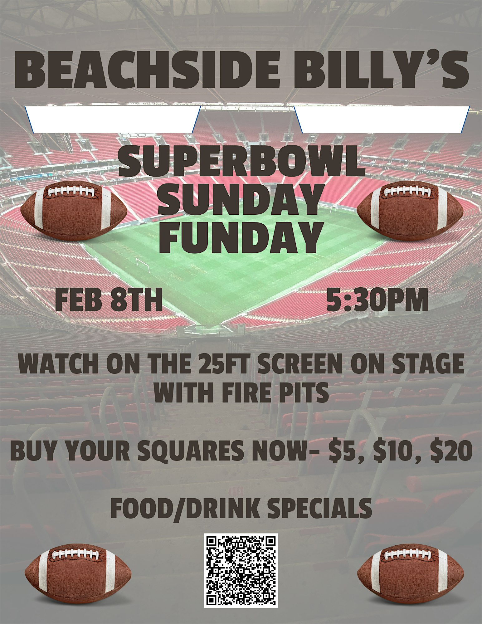 Watch the Super Bowl on our 25ft stage screen with fire pits, food & drink specials, and game-day squares at Beachside Billy’s.