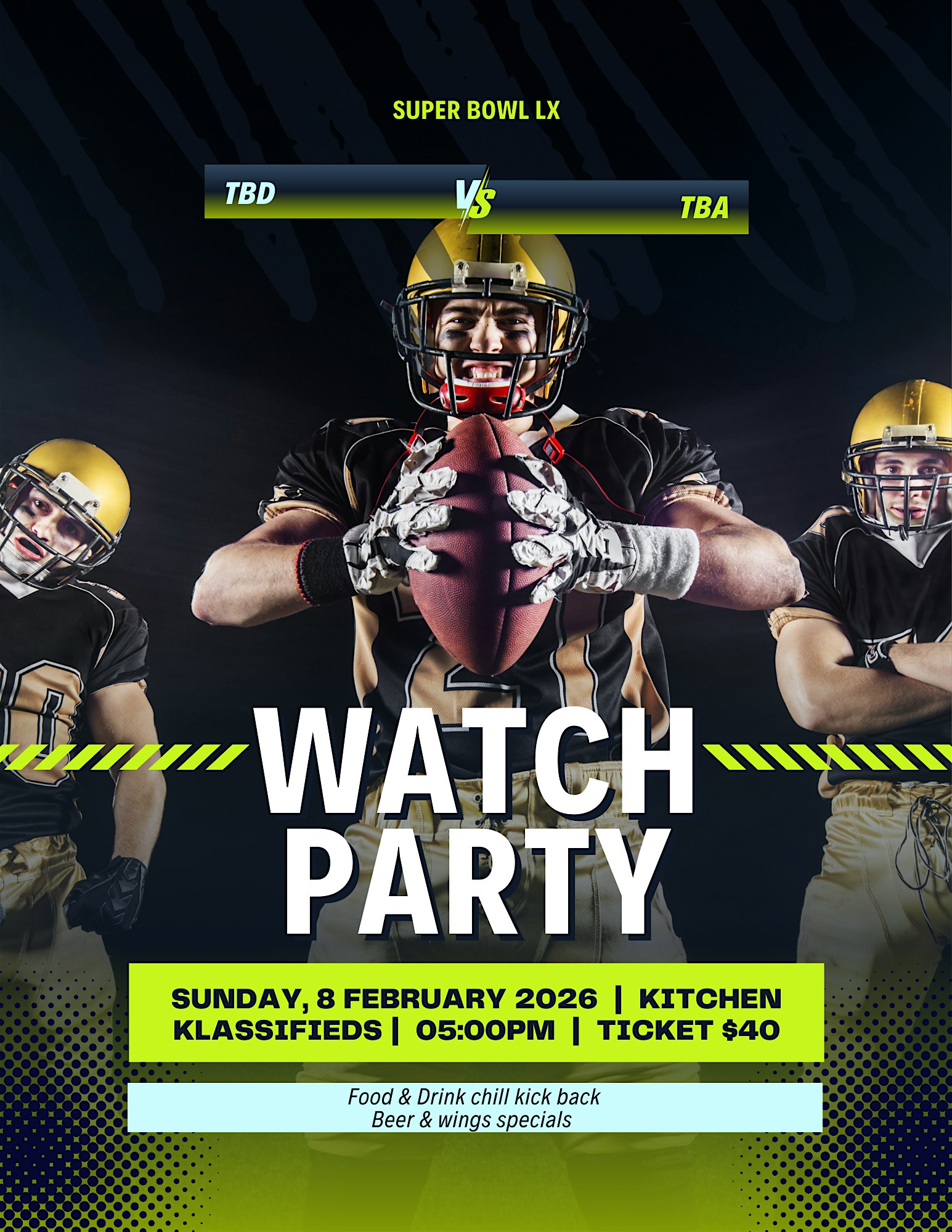 Join us for the ultimate Super Bowl 2026 Watch Party at Kitchen Klassifieds Café!