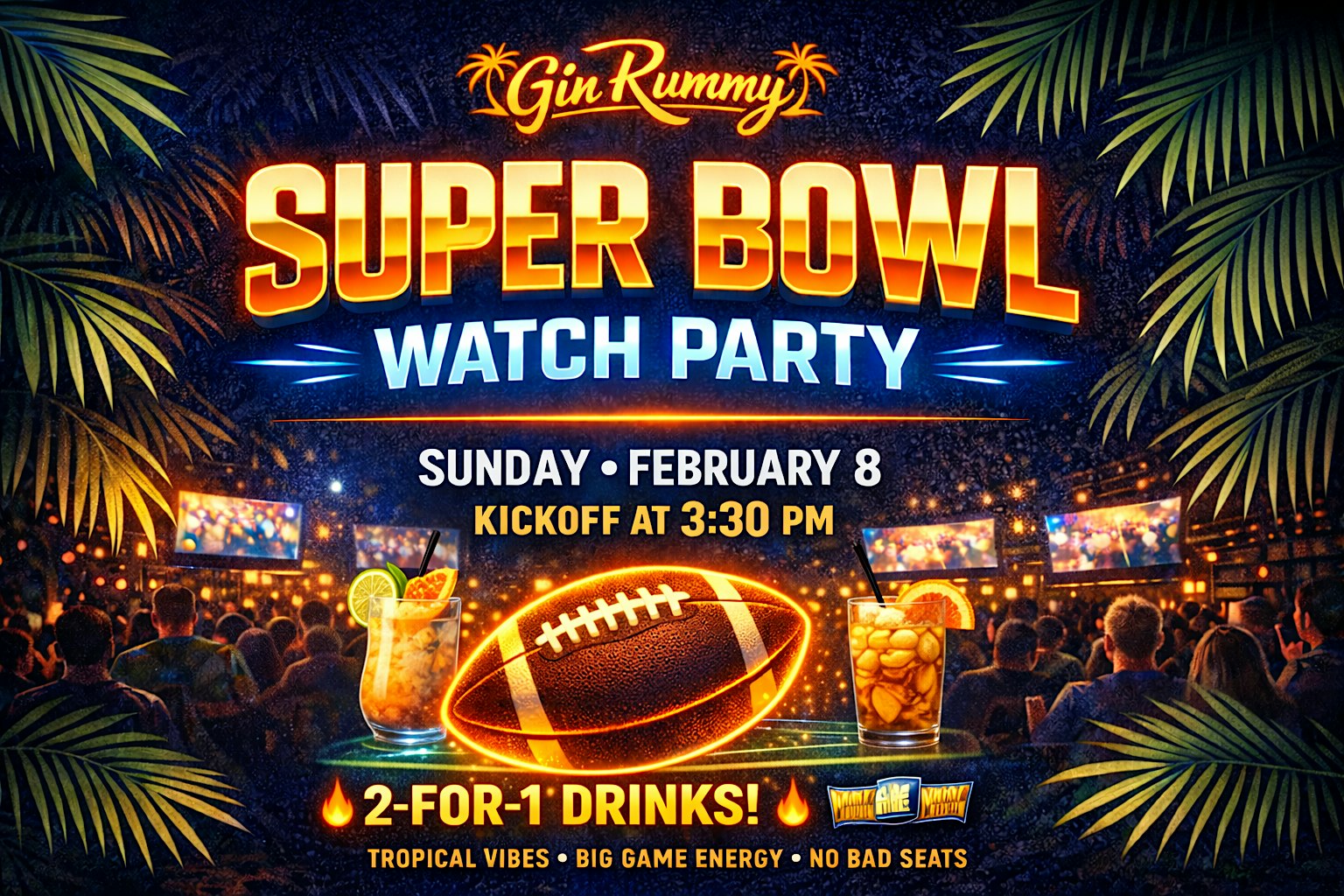 Get ready for an epic Super Bowl night right here at the Gin Rummy Bar! Join us in person for great company, big screens, and all the electric game action. Whether you’re a hardcore fan or just here for the fun, this is the spot to catch every play and cheer loud. Bring your friends, grab a drink, and let’s make this Super Bowl Watch Party one to remember! 2 for 1 Happy Hour from 3-7.