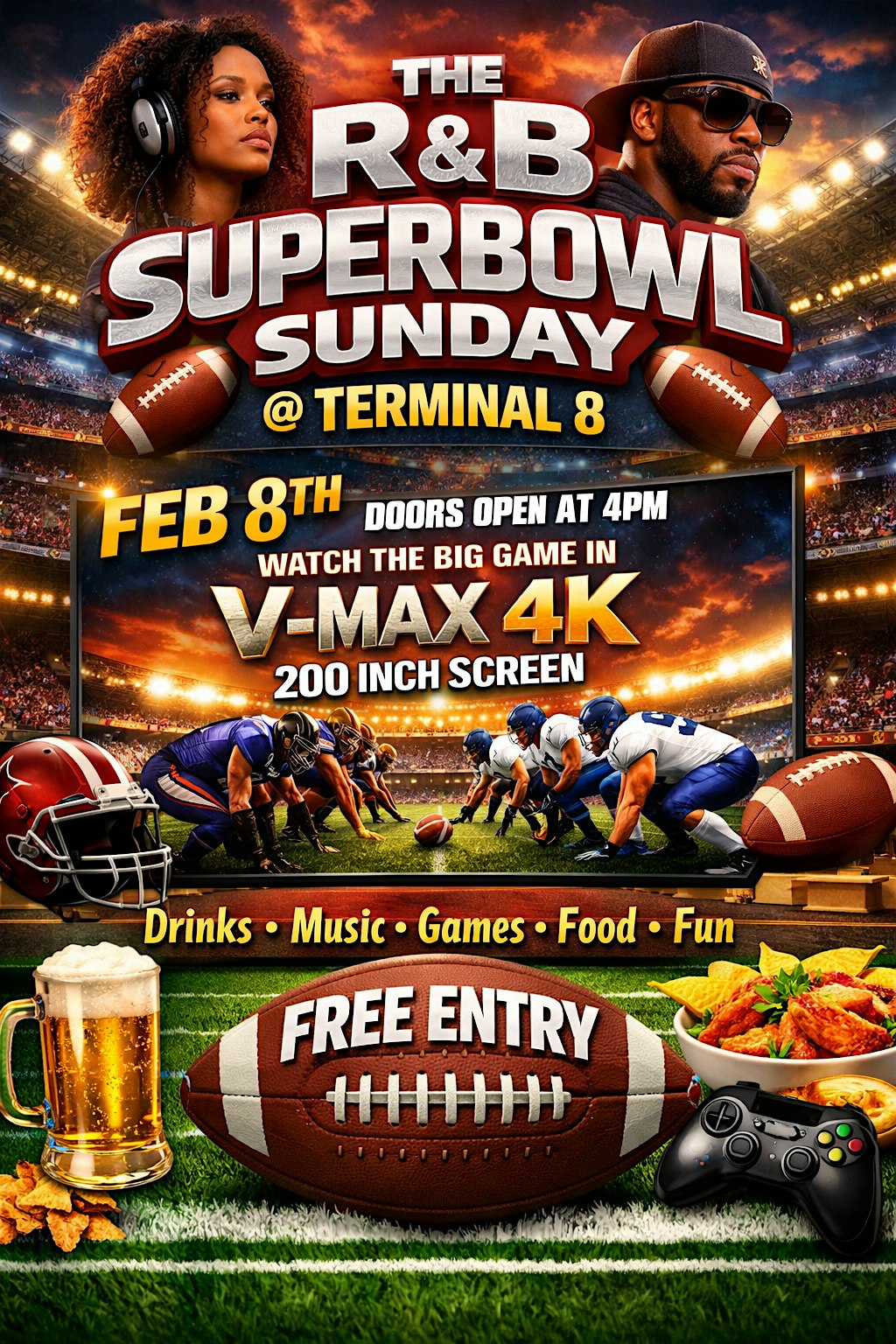 by admin28Jan THE R&B SUPERBOWL SUNDAY @ TERMINAL 8 at Terminal 8 – Bar & Lounge – Raleigh, NC THE R&B SUPERBOWL SUNDAY @ TERMINAL 8 at Terminal 8 – Bar & Lounge – Raleigh, NC 1 1 people viewed this event. THE R&B SUPERBOWL SUNDAY @ TERMINAL 8 FEB 8TH doors open at 4pm Watch the BIG GAME IN V-MAX 4K 200 inch screen Drinks Music Games Food Fun Tickets-RSVP Link Date And Time Sunday, February 8th, 2026 04:00 PM (PST) Venue Terminal 8 - Bar & Lounge Location 2109 Avent Ferry Road #152, Raleigh, NC 27606 Event Types Party or Social GatheringSportsSuper Bowl Sunday Event Category North CarolinaRaleigh Share With Friends Facebook Twitter Linkedin Xing Pinterest Share This Post: