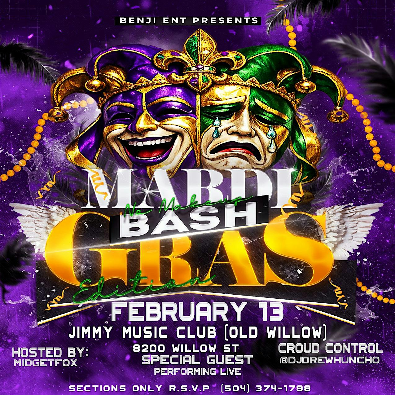 by admin07Feb BENJI ENT: NOMAKEUP BASHH MARDI GRAS EDITION at Jimmy’s Music Club – New Orleans, LA BENJI ENT: NOMAKEUP BASHH MARDI GRAS EDITION at Jimmy’s Music Club – New Orleans, LA 1 1 people viewed this event. Get ready to party like it’s Mardi Gras with BENJI ENT at the NOMAKEUP BASHH – it’s gonna be wild! Tickets-RSVP Link Date And Time Saturday, February 14th, 2026 04:00 AM (PST) Venue Jimmy's Music Club Location 8200 Willow Street Event Types Mardi GrasParty or Social Gathering Event Category LouisianaNew Orleans Share With Friends Facebook Twitter Linkedin Xing Pinterest Share This Post:
