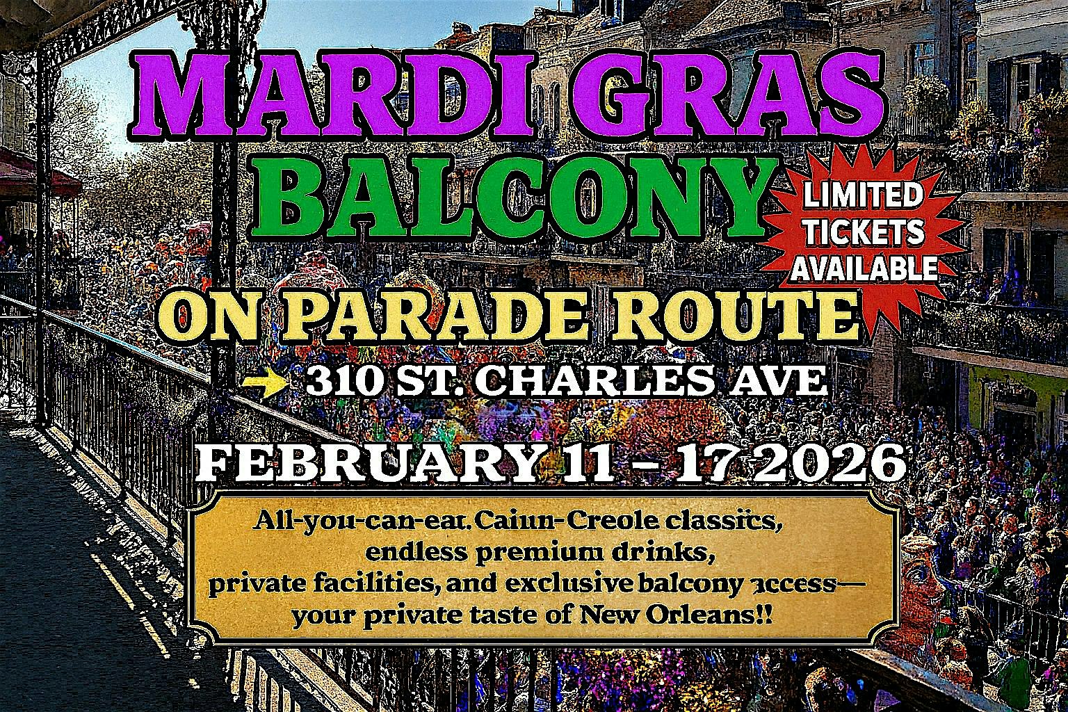 by admin07Feb ***Mardi Gras Balcony @ DAISY DUKES** Tickets limited to only 35 per parade at 310 St Charles Ave – New Orleans, LA ***Mardi Gras Balcony @ DAISY DUKES** Tickets limited to only 35 per parade at 310 St Charles Ave – New Orleans, LA 1 1 people viewed this event. Get ready to party in style at the Mardi Gras Balcony @ DAISY DUKES – only 35 tickets available per parade, so grab yours now! Tickets-RSVP Link Date And Time Saturday, February 14th, 2026 04:00 PM (PST) Venue 310 St Charles Ave Location 310 Saint Charles Avenue Event Types Mardi GrasParty or Social Gathering Event Category LouisianaNew Orleans Share With Friends Facebook Twitter Linkedin Xing Pinterest Share This Post: