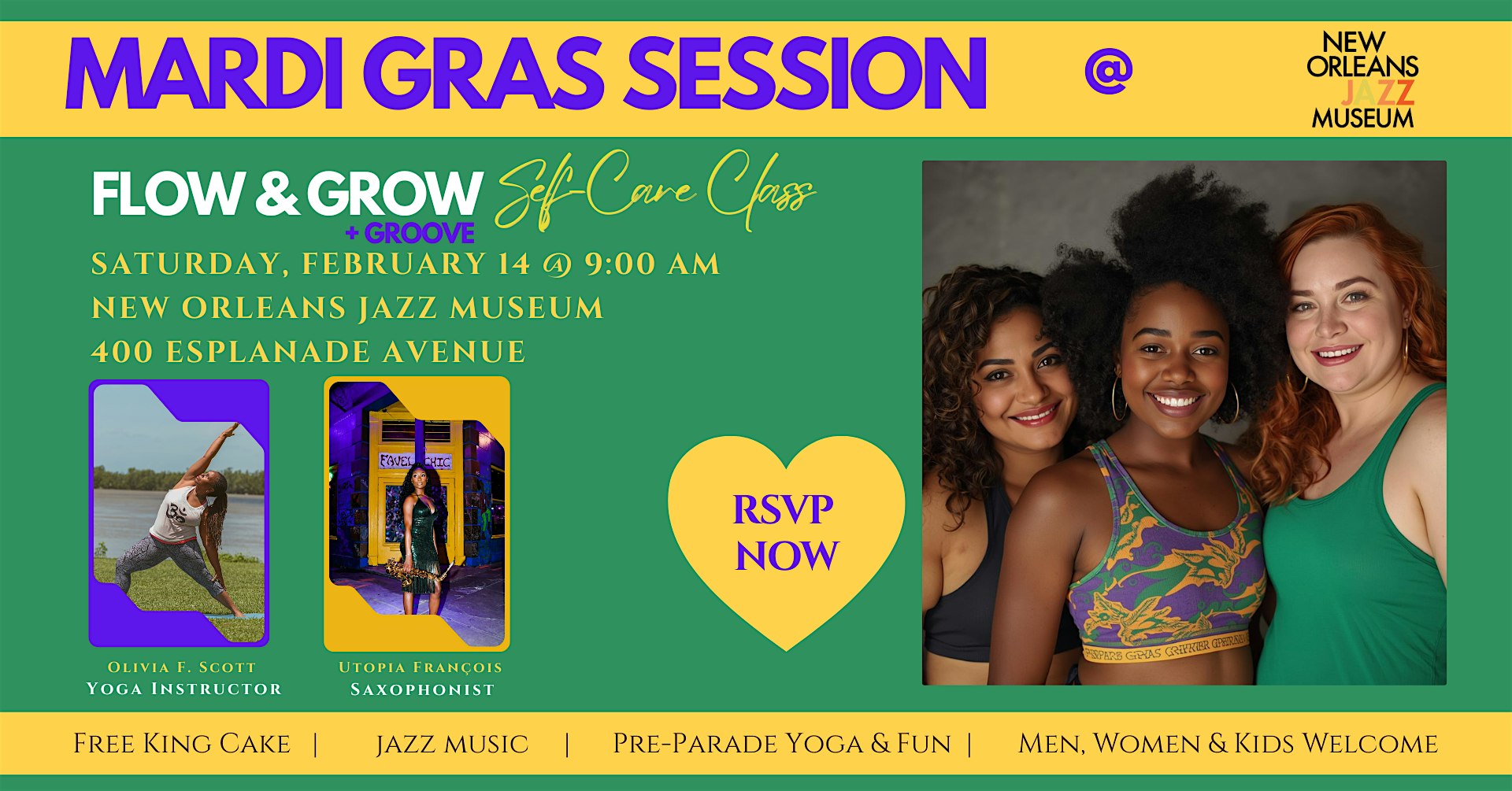 by admin07Feb Mardi Gras Edition: Flow & Grow + Groove in Carnival Season at New Orleans Jazz Museum – New Orleans, LA Mardi Gras Edition: Flow & Grow + Groove in Carnival Season at New Orleans Jazz Museum – New Orleans, LA 2 2 people viewed this event. Pre-Parade, Carnival vinyasa yoga & community connection class, set to Live Jazz by Lady Saxophonist Utopia François with FREE King Cake! Tickets-RSVP Link Date And Time Saturday, February 14th, 2026 03:00 PM (PST) Venue New Orleans Jazz Museum Location 400 Esplanade Avenue Event Types Mardi Gras Event Category LouisianaNew Orleans Share With Friends Facebook Twitter Linkedin Xing Pinterest Share This Post: