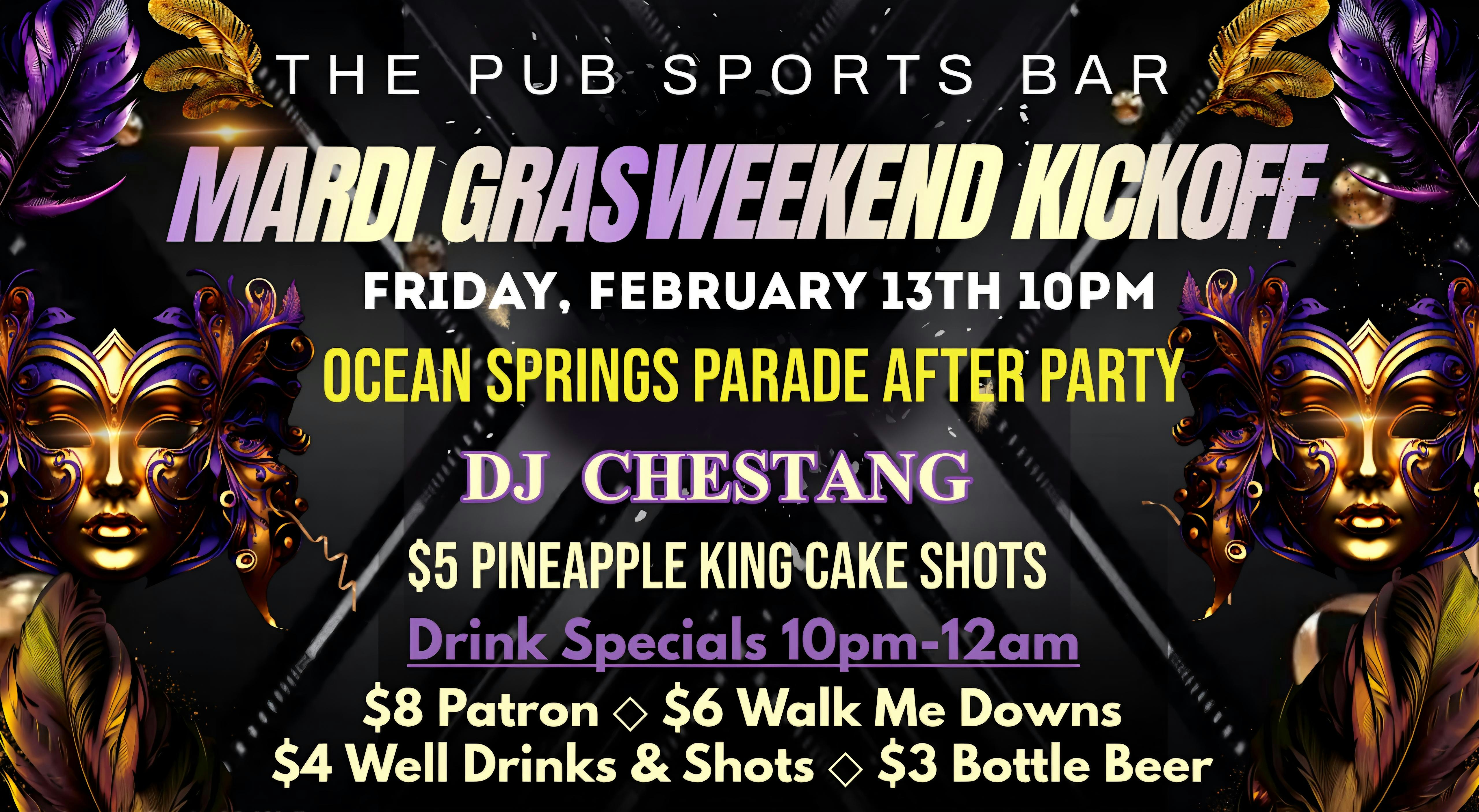 by admin07Feb Mardi Gras Weekend Kickoff at The Pub Sports Bar – D’Iberville, MS Mardi Gras Weekend Kickoff at The Pub Sports Bar – D’Iberville, MS 2 2 people viewed this event. Kick Off the Mardi Gras weekend at The Pub with your favorite DJ on the Gulf Coast, DJ Chestang !!! Drink Specials 10pm-12am. Tickets-RSVP Link Date And Time Saturday, February 14th, 2026 03:00 AM (PST) Venue The Pub Sports Bar Location 3254 Mallett Road Event Types Concert or PerformanceMardi Gras Event Category Mississippi Share With Friends Facebook Twitter Linkedin Xing Pinterest Share This Post: