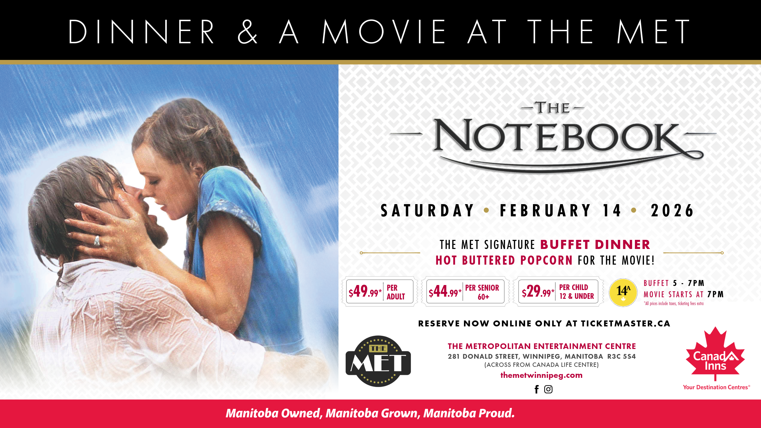 Here’s what all The Notebook – Dinner and Movie At The MET fans must know before attending an event at The Metropolitan Entertainment Centre. To ensure a stress-free experience, we recommend arriving at the venue at least 45 to 60 minutes prior to the scheduled start time. This allows ample time for navigating local Winnipeg traffic, securing parking, standing in long wait lines and passing through venue security.