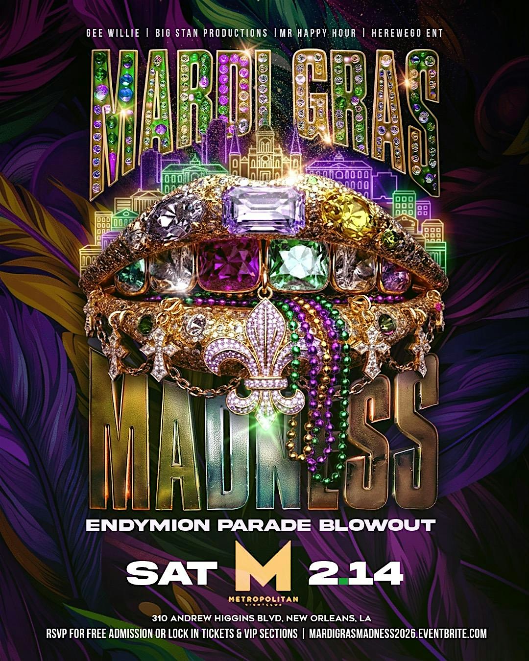 by admin07Feb MARDI GRAS MADNESS ENDYMION PARADE AFTER PARTY @ THE METROPOLITAN at The Metropolitan Nightclub – New Orleans, LA MARDI GRAS MADNESS ENDYMION PARADE AFTER PARTY @ THE METROPOLITAN at The Metropolitan Nightclub – New Orleans, LA 1 1 people viewed this event. Get ready to party hard after the Endymion Parade at The Metro, Mardi Gras madness all night long! Tickets-RSVP Link Date And Time Sunday, February 15th, 2026 04:00 AM (PST) Venue The Metropolitan Nightclub Location 310 Andrew Higgins Dr Event Types Mardi GrasParty or Social Gathering Event Category LouisianaNew Orleans Share With Friends Facebook Twitter Linkedin Xing Pinterest Share This Post: