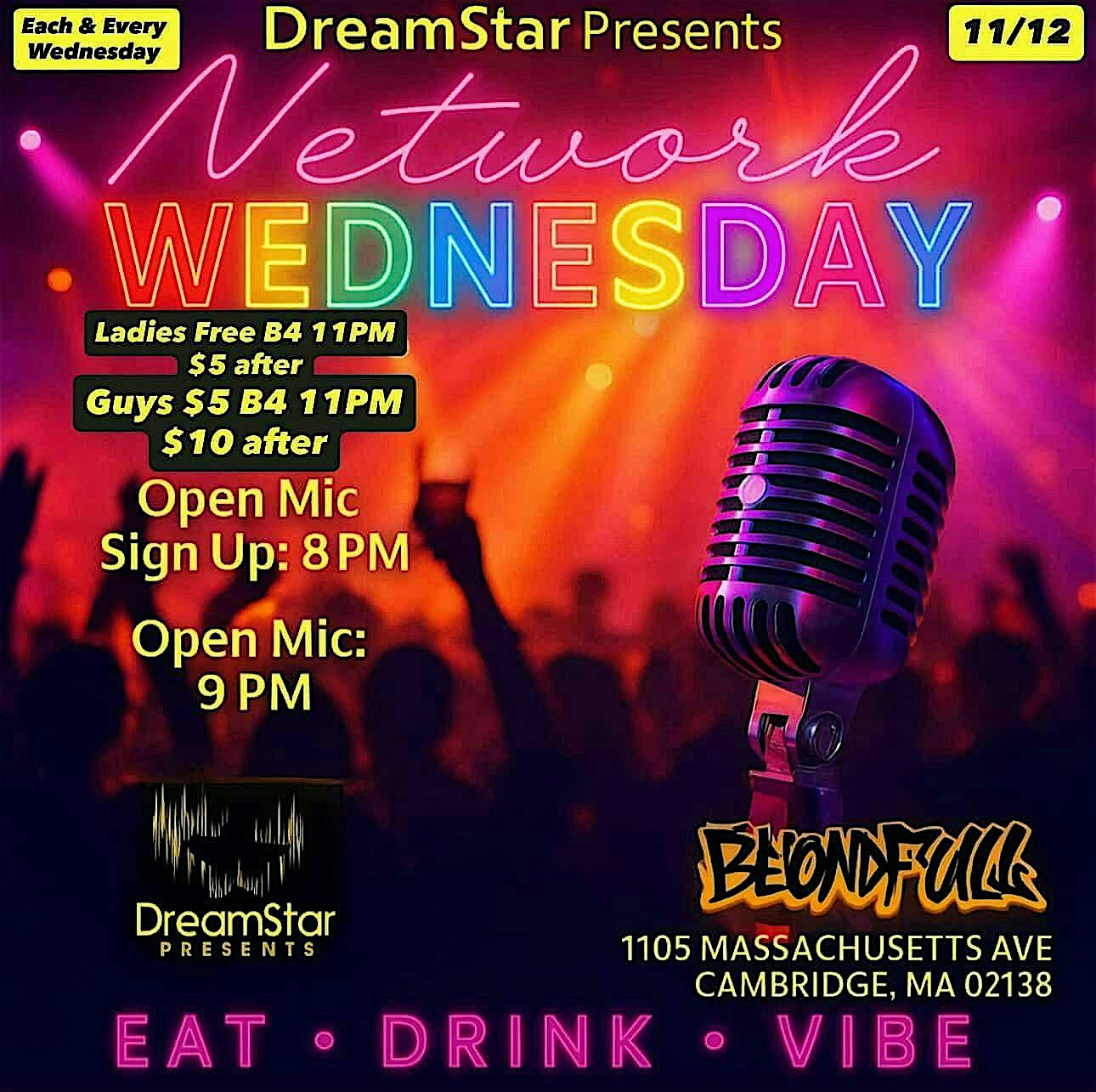 by admin13Feb ☕️NETWORK WEDNESDAYS☕️ @ BEYOND FULL FR❄️ST FGXzotix at Beyond Full – Cambridge, MA ☕️NETWORK WEDNESDAYS☕️ @ BEYOND FULL FR❄️ST FGXzotix at Beyond Full – Cambridge, MA 1 1 people viewed this event. Every Wednesday come join us for a unique affair in Harvard Square, Cambridge. Boston’s brightest artist will be in the building. Tickets-RSVP Link Date And Time Thursday, February 19th, 2026 01:00 AM (PST) Venue Beyond Full Location 1105 Massachusetts Avenue, Cambridge, MA 2138 Event Types Concert or PerformanceMusic Event Category Massachusetts Share With Friends Facebook Twitter Linkedin Xing Pinterest Share This Post: