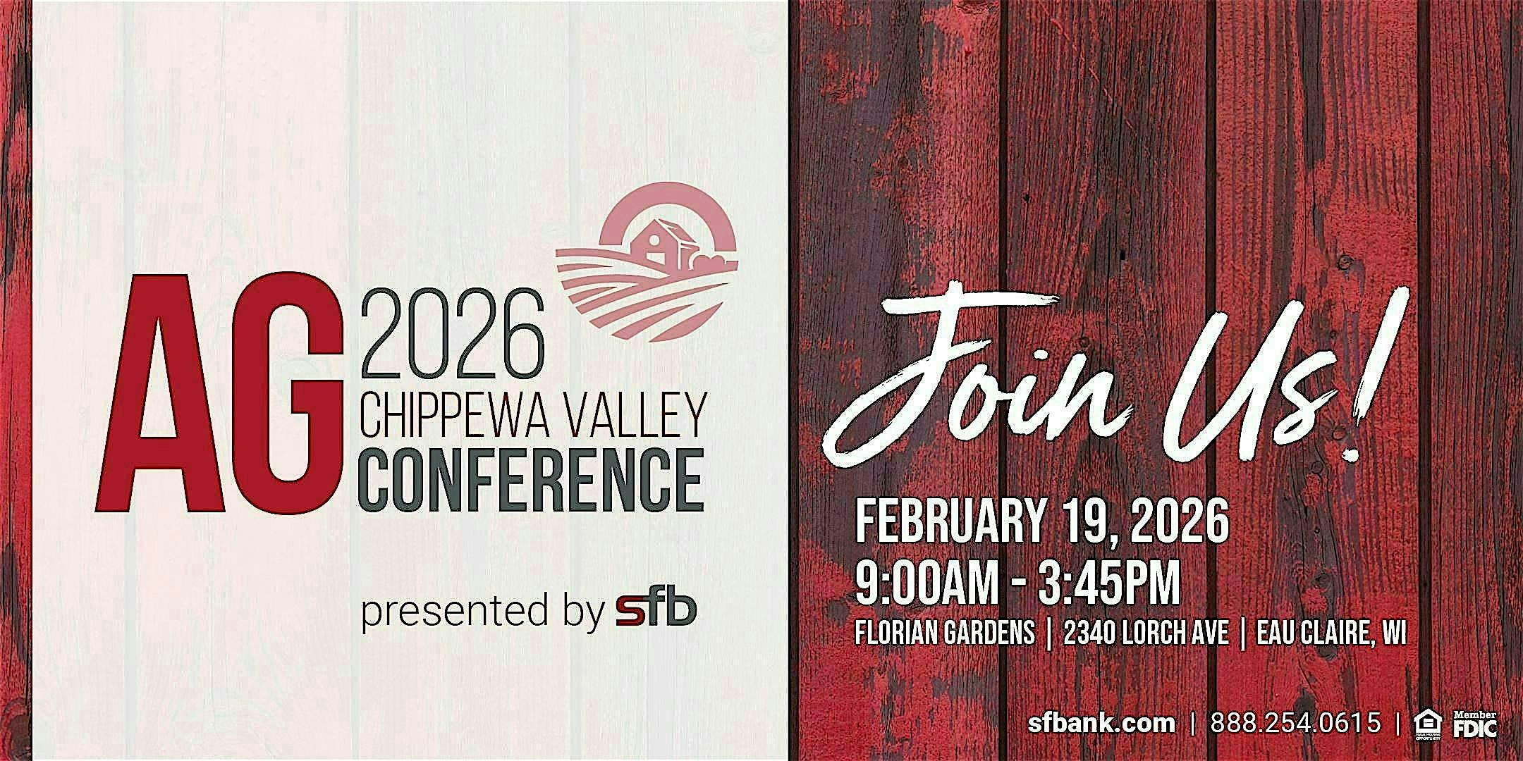 by admin12Feb 2026 Chippewa Valley Ag Conference at The Florian Gardens Conference Center – Eau Claire, WI 2026 Chippewa Valley Ag Conference at The Florian Gardens Conference Center – Eau Claire, WI 3 3 people viewed this event. Join us at the 2026 Chippewa Valley Ag Conference for a day of learning, networking, and celebrating all things agriculture in our community Tickets-RSVP Link Date And Time Thursday, February 19th, 2026 03:00 PM (PST) Venue The Florian Gardens Conference Center Location 2340 Lorch Avenue, Eau Claire, WI 54701 Event Types Community & CultureOther Event Category Wisconsin Share With Friends Facebook Twitter Linkedin Xing Pinterest Share This Post: