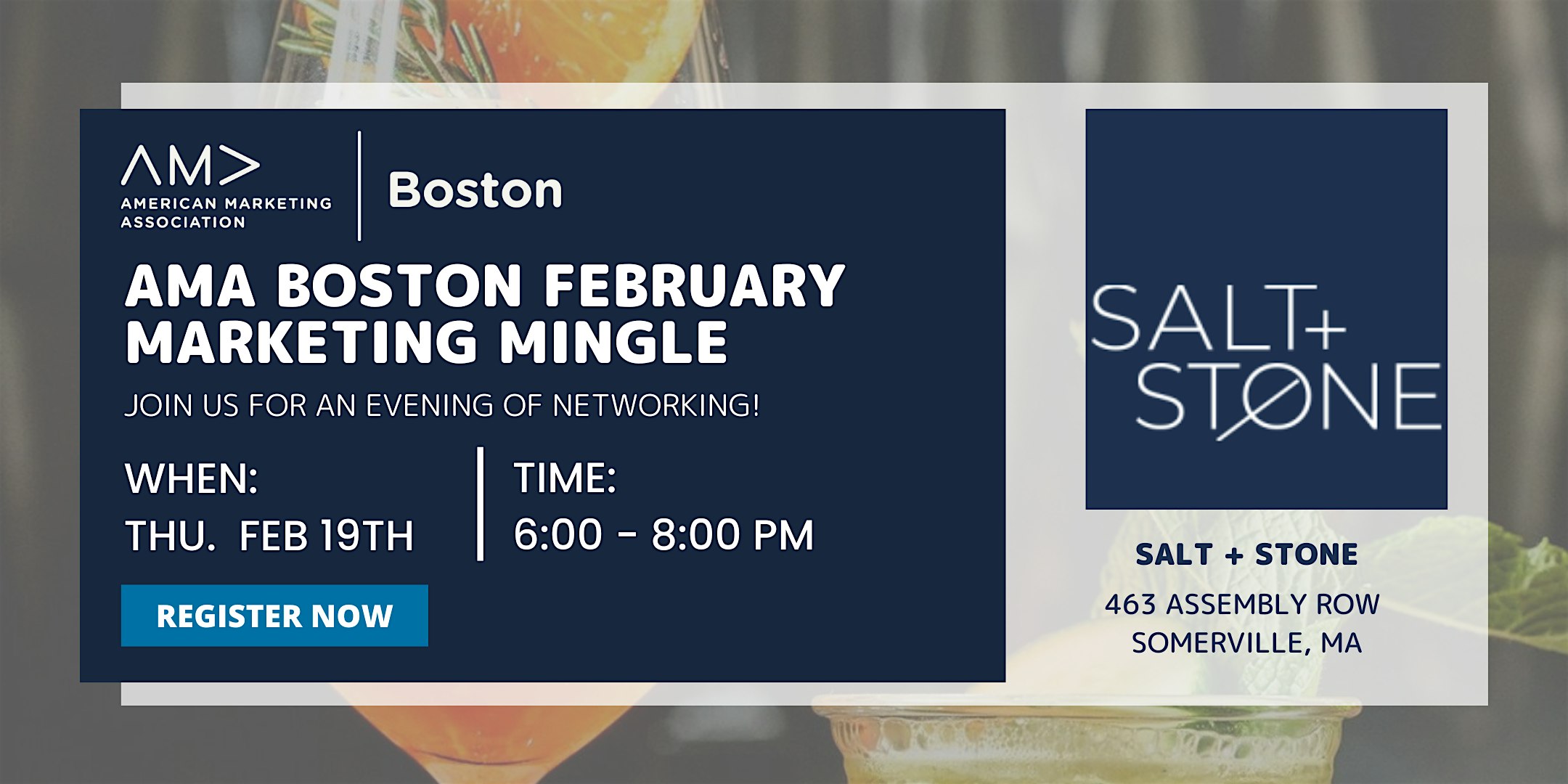 by admin12Feb AMA Boston: February Marketing Mingle at Salt + Stone – Somerville, MA AMA Boston: February Marketing Mingle at Salt + Stone – Somerville, MA 1 1 people viewed this event. Get ready to mix and mingle with your fellow marketers at the February Marketing Mingle on Thursday, February 19th Tickets-RSVP Link Date And Time Thursday, February 19th, 2026 11:00 PM (PST) Venue Salt + Stone Location 463 Assembly Row, Somerville, MA 2145 Event Category Massachusetts Share With Friends Facebook Twitter Linkedin Xing Pinterest Share This Post: