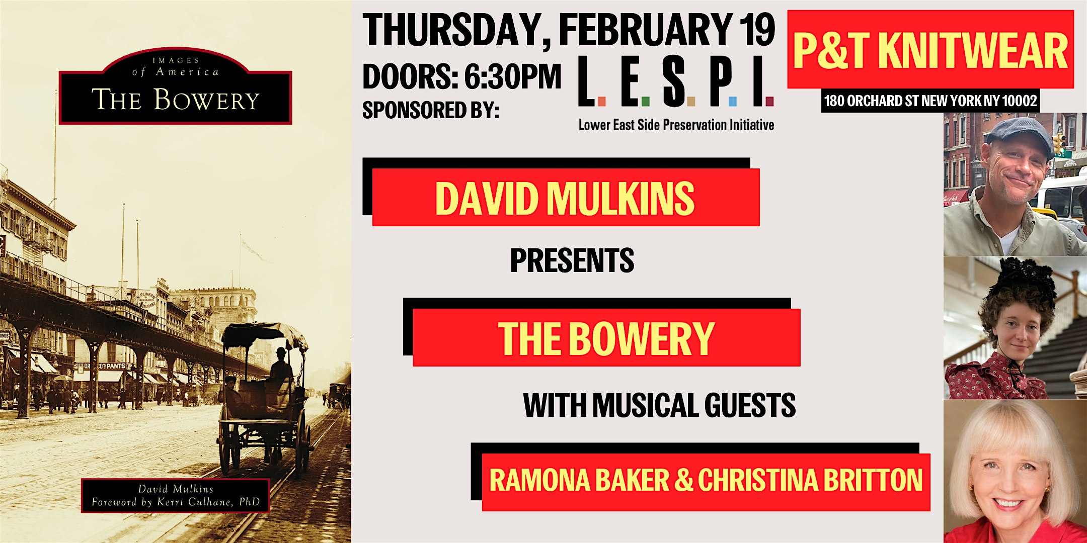 by admin12Feb An Illustrated Talk on “The Bowery” with David Mulkins at P&T Knitwear Books & Podcasts – New York, NY An Illustrated Talk on “The Bowery” with David Mulkins at P&T Knitwear Books & Podcasts – New York, NY 5 5 people viewed this event. With ragtime pianist Ramona Baker, sponsored by the Lower East Side Preservation Initiative Tickets-RSVP Link Date And Time Thursday, February 19th, 2026 11:00 PM (PST) Venue P&T Knitwear Books & Podcasts Location 180 Orchard Street, New York, NY 10002 Event Types Performing & Visual Arts Event Category New YorkNew York City Share With Friends Facebook Twitter Linkedin Xing Pinterest Share This Post: