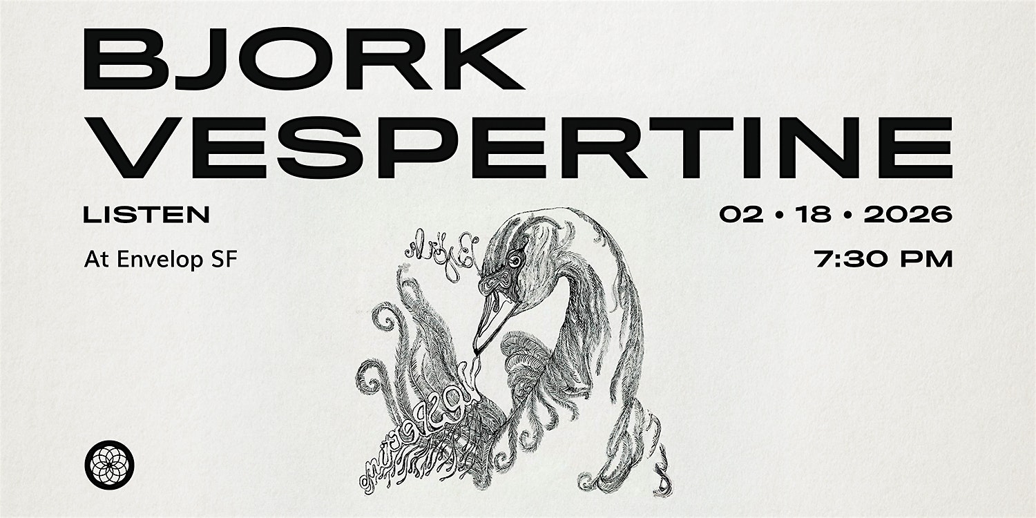 by admin12Feb Bjork – Vespertine : LISTEN | Envelop SF (7:30pm) at Envelop SF – San Francisco, CA Bjork – Vespertine : LISTEN | Envelop SF (7:30pm) at Envelop SF – San Francisco, CA 3 3 people viewed this event. Experience the creativity and emotion of Bjork’s classic like never before. Tickets-RSVP Link Date And Time Thursday, February 19th, 2026 03:00 AM (PST) Venue Envelop SF Location 900 Marin St., San Francisco, CA 94124 Event Types Concert or PerformanceMusic Event Category CaliforniaSan Francisco Share With Friends Facebook Twitter Linkedin Xing Pinterest Share This Post: