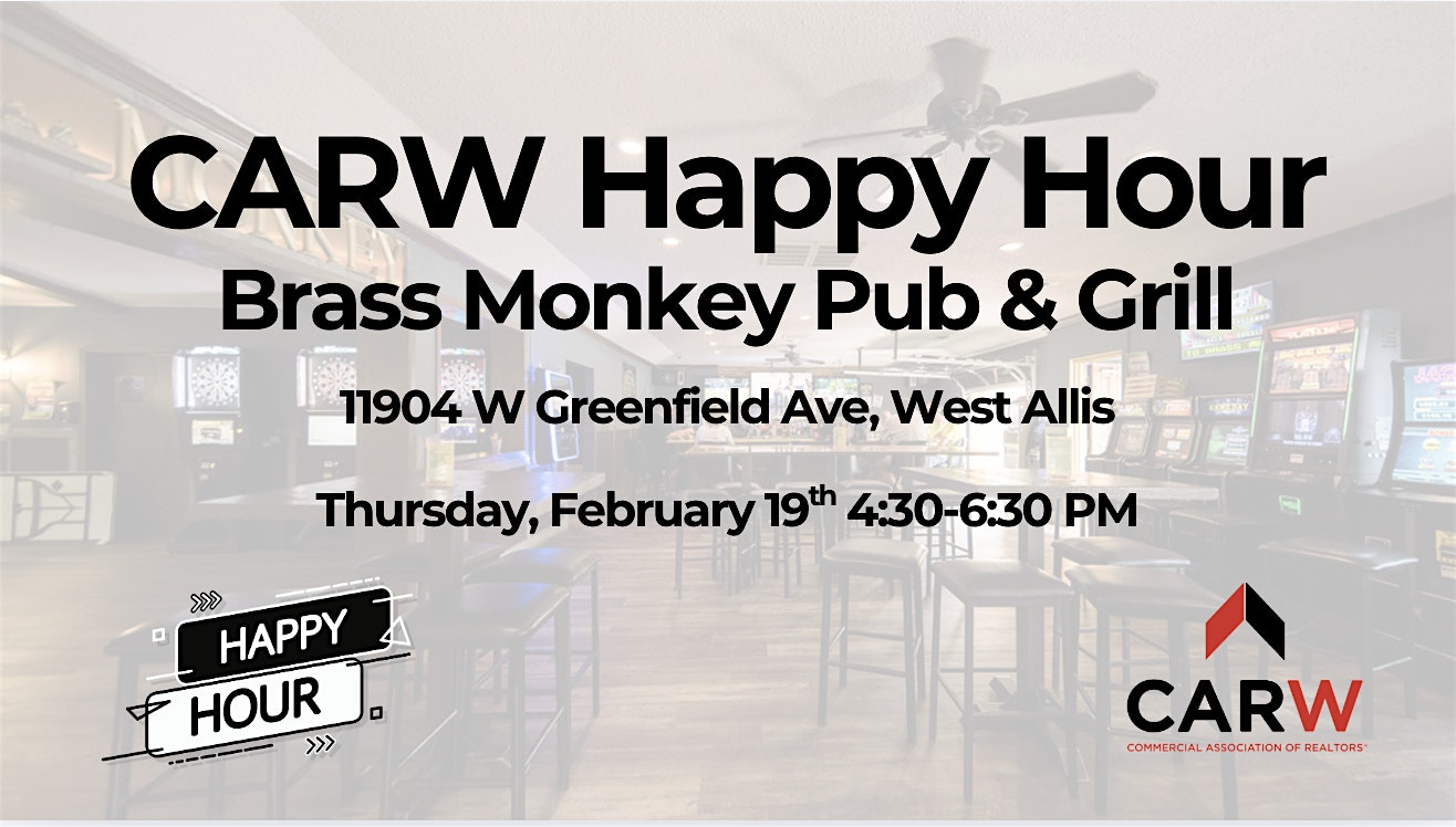 by admin12Feb CARW Happy Hour – Brass Monkey at Brass Monkey Pub – West Allis, WI CARW Happy Hour – Brass Monkey at Brass Monkey Pub – West Allis, WI 5 5 people viewed this event. Shake off the post-holiday haze and get back to business with us! Tickets-RSVP Link Date And Time Thursday, February 19th, 2026 10:00 PM (PST) Venue Brass Monkey Pub Location 11904 West Greenfield Avenue, West Allis, WI 53214 Event Category Wisconsin Share With Friends Facebook Twitter Linkedin Xing Pinterest Share This Post: