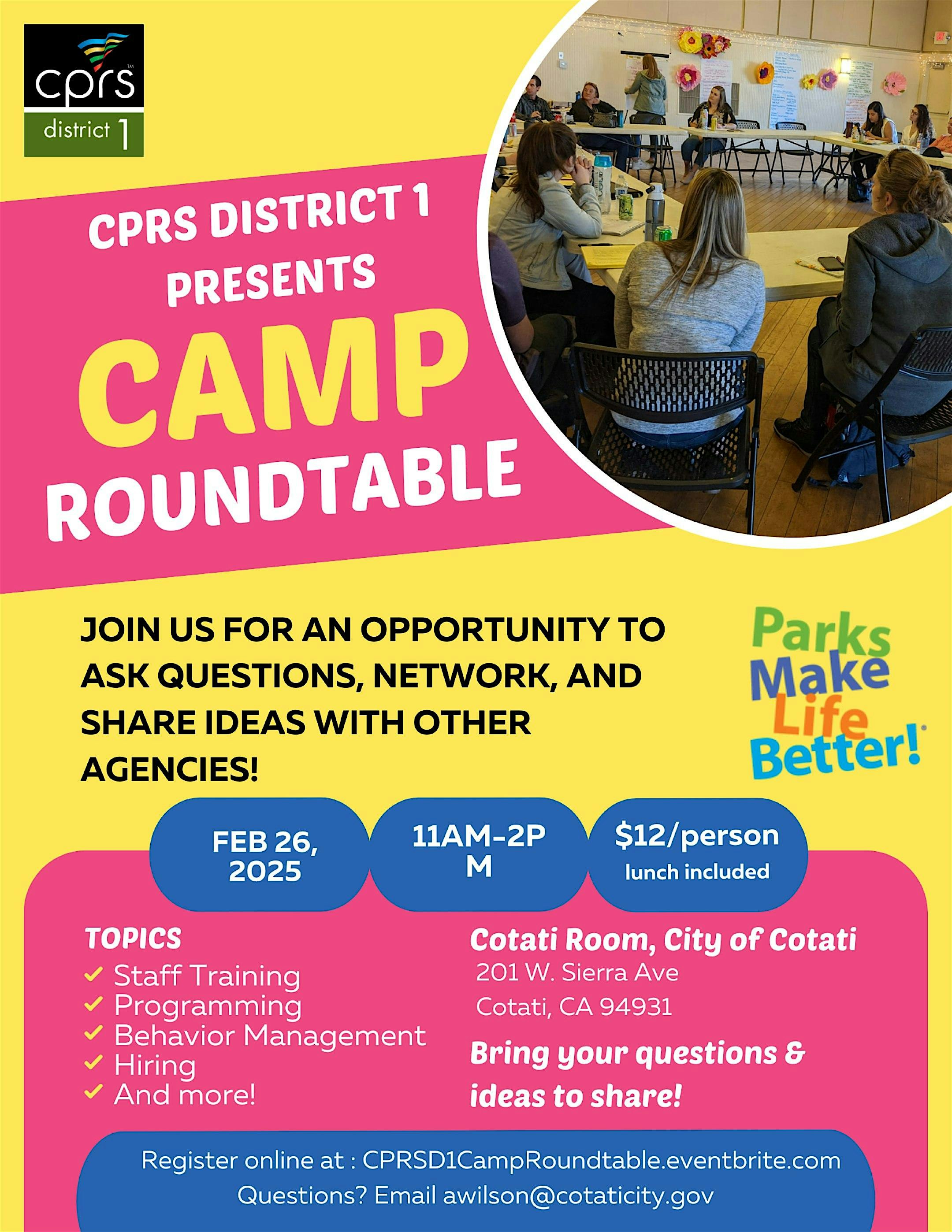 by admin12Feb CPRS District 1 Camp Roundtable at Ray Miller Community Center – Cotati, CA CPRS District 1 Camp Roundtable at Ray Miller Community Center – Cotati, CA 3 3 people viewed this event. Join us at the CPRS District 1 Camp Roundtable for a fun and informative gathering to discuss all things related to summer camps. Tickets-RSVP Link Date And Time Thursday, February 19th, 2026 07:00 PM (PST) Venue Ray Miller Community Center Location 216 East School Street, Cotati, CA 94931 Event Types Other Event Category California Share With Friends Facebook Twitter Linkedin Xing Pinterest Share This Post: