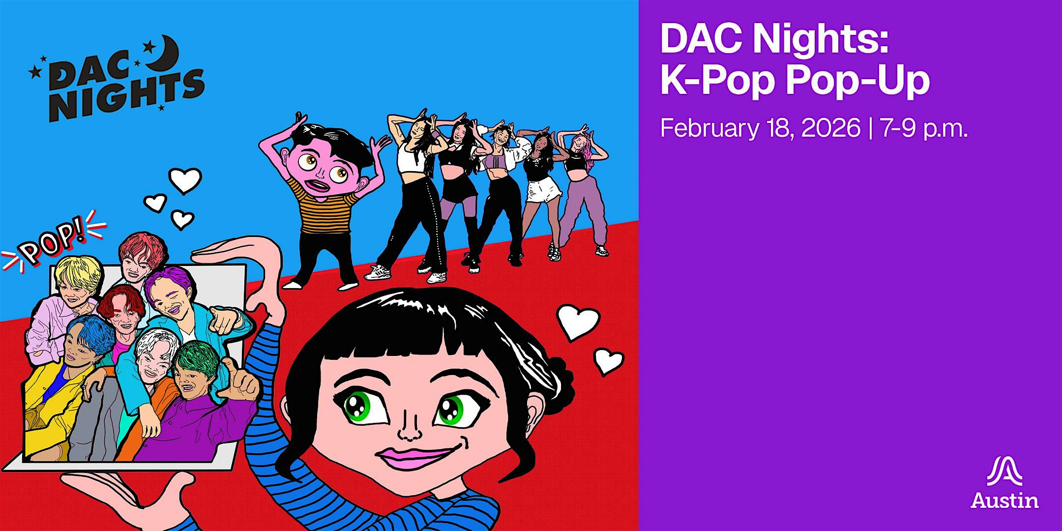 by admin12Feb DAC Nights: K-Pop Pop-Up at Dougherty Arts Center – Austin, TX DAC Nights: K-Pop Pop-Up at Dougherty Arts Center – Austin, TX 4 4 people viewed this event. Learn your favorite K-Pop dances and make your own decorated pop-up photocards! Tickets-RSVP Link Date And Time Thursday, February 19th, 2026 01:00 AM (PST) Venue Dougherty Arts Center Location 1110 Barton Springs Road, Austin, TX 78704 Event Types Party or Social GatheringPerforming & Visual Arts Event Category AustinTexas Share With Friends Facebook Twitter Linkedin Xing Pinterest Share This Post:
