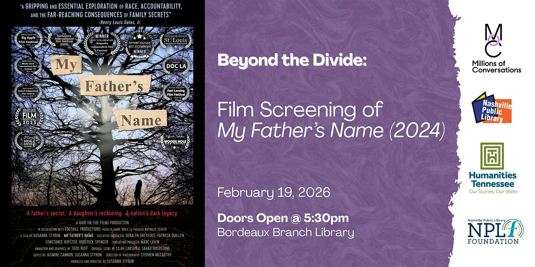 by admin12Feb Film Screening: My Father’s Name (2024) at Nashville Public Library Bordeaux Branch – Nashville, TN Film Screening: My Father’s Name (2024) at Nashville Public Library Bordeaux Branch – Nashville, TN 2 2 people viewed this event. A father’s secret. A daughter’s reckoning. A nation’s dark legacy. A Documentary Short Film by Susanna Styron. Tickets-RSVP Link Date And Time Thursday, February 19th, 2026 11:00 PM (PST) Venue Nashville Public Library Bordeaux Branch Location 4000 Clarksville Pike, Nashville, TN 37218 Event Types Community & Culture Event Category NashvilleTennessee Share With Friends Facebook Twitter Linkedin Xing Pinterest Share This Post:
