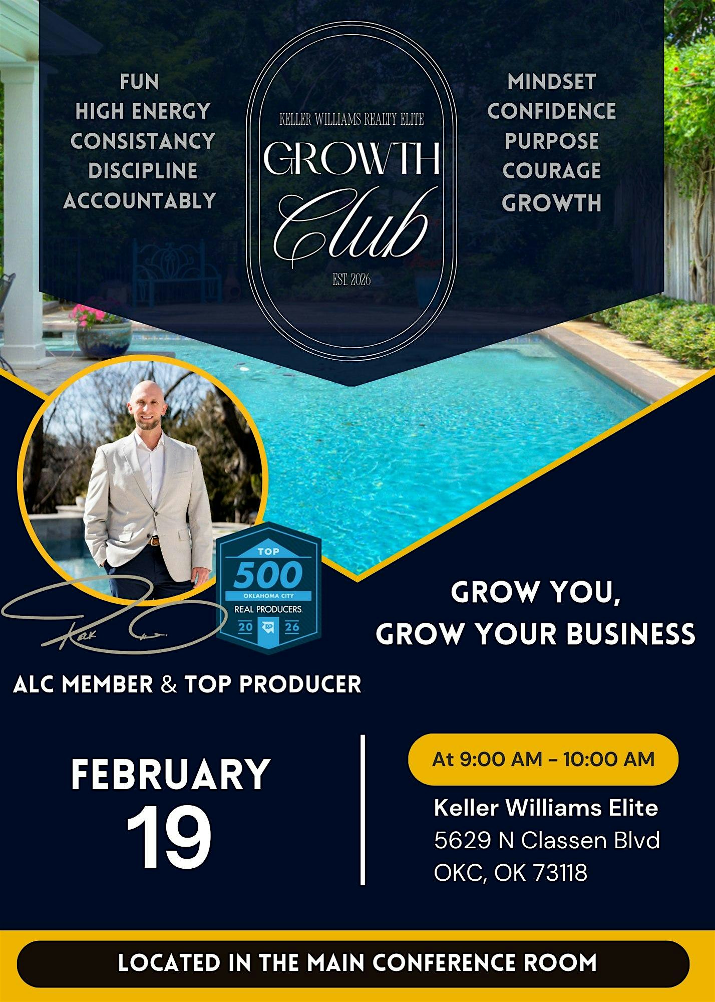 by admin12Feb Growth Club: Goal Setting with Joey Keck at Keller Williams Realty Elite – Oklahoma City, OK Growth Club: Goal Setting with Joey Keck at Keller Williams Realty Elite – Oklahoma City, OK 6 6 people viewed this event. This is for agents who want to level up, in life and in real estate. Tickets-RSVP Link Date And Time Thursday, February 19th, 2026 03:00 PM (PST) Venue Keller Williams Realty Elite Location 5629 North Classen Boulevard, Oklahoma City, OK 73118 Event Category OklahomaOklahoma City Share With Friends Facebook Twitter Linkedin Xing Pinterest Share This Post: