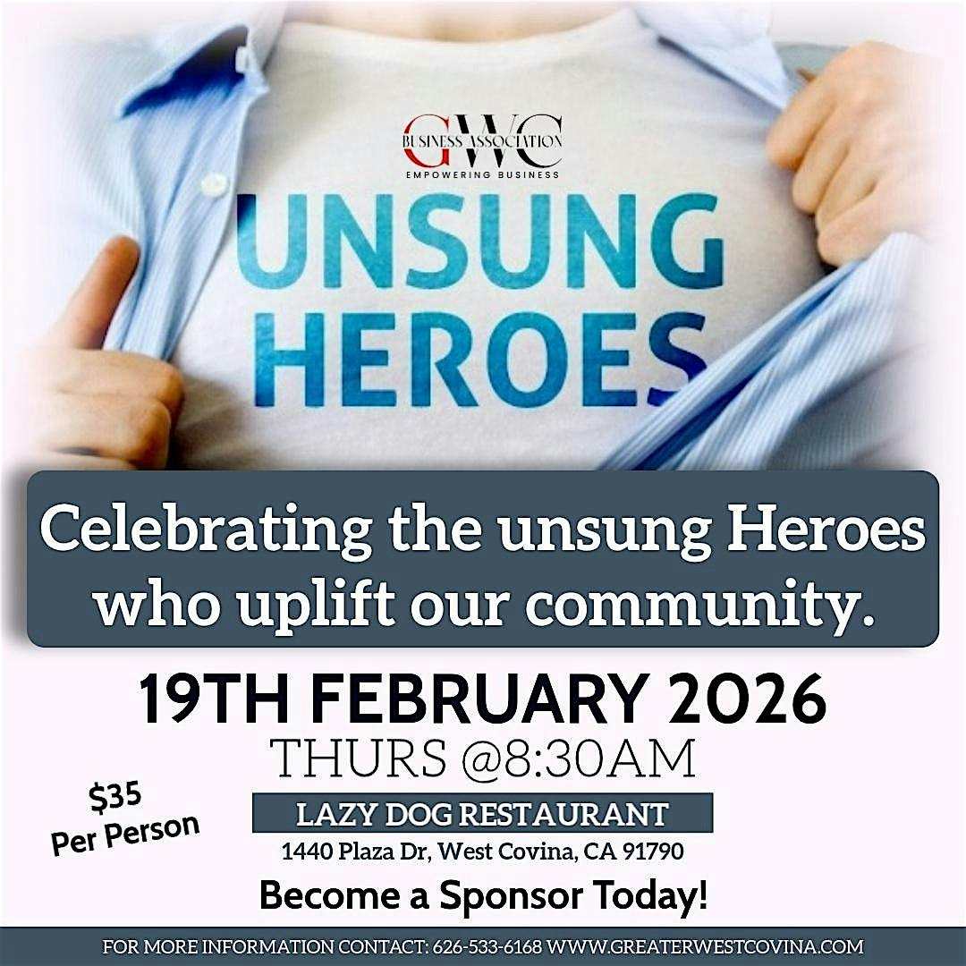 by admin12Feb GWC Unsung Heroes Breakfast at Lazy Dog Restaurant & Bar – West Covina, CA GWC Unsung Heroes Breakfast at Lazy Dog Restaurant & Bar – West Covina, CA 3 3 people viewed this event. Join us for a heartwarming morning celebrating the unsung heroes in our community at the GWC Unsung Heroes Breakfast! Nominate someone today Tickets-RSVP Link Date And Time Thursday, February 19th, 2026 04:00 PM (PST) Venue Lazy Dog Restaurant & Bar Location 1440 Plaza Drive, West Covina, CA 91790 Event Category California Share With Friends Facebook Twitter Linkedin Xing Pinterest Share This Post: