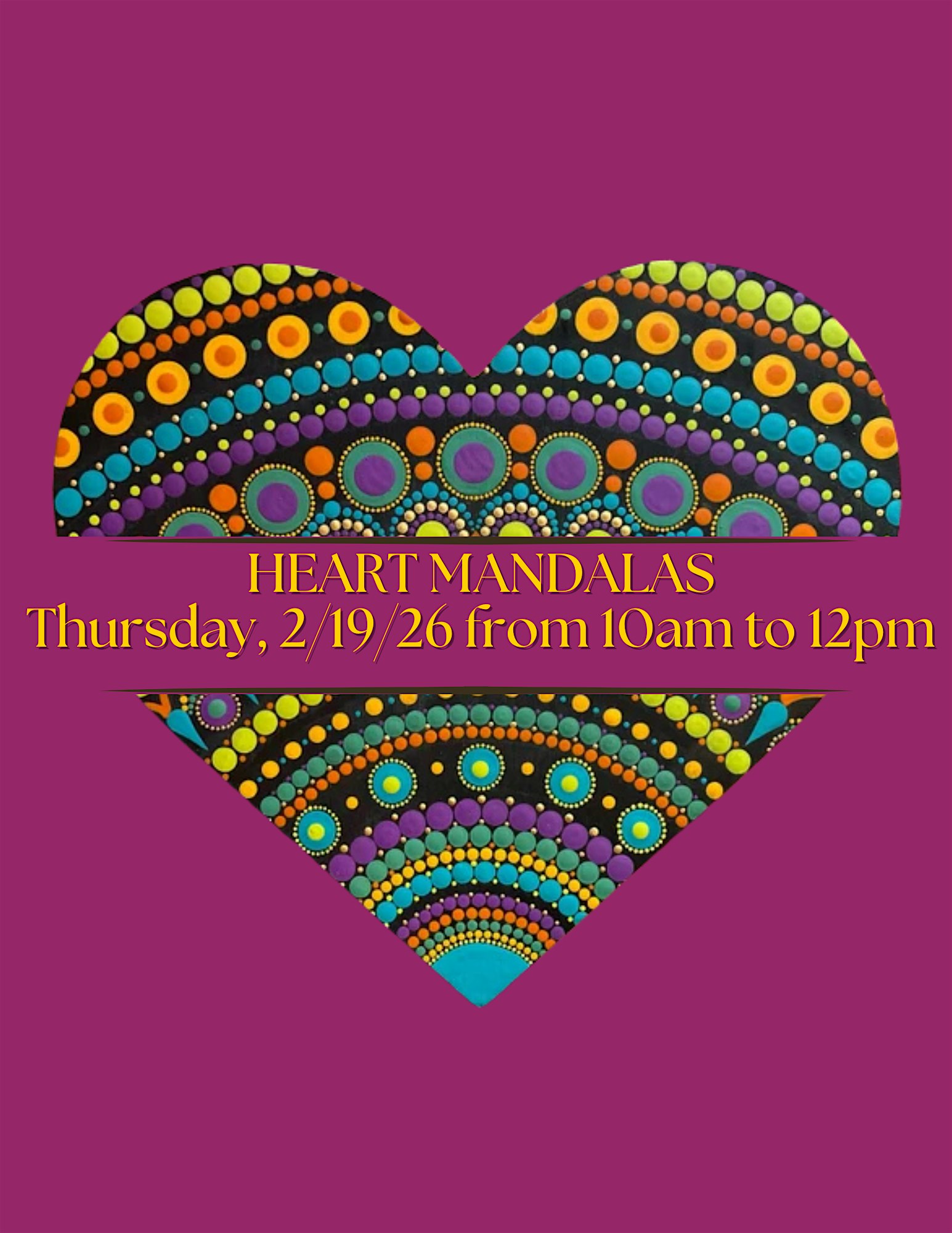 by admin12Feb HEART MANDALAS – Paint & Wellness Class at 2 Tunxis Rd – Simsbury, CT HEART MANDALAS – Paint & Wellness Class at 2 Tunxis Rd – Simsbury, CT 2 2 people viewed this event. Create a colorful heart mandala in this beginner-friendly dot-painting class focused on mindfulness and creative expression. Tickets-RSVP Link Date And Time Thursday, February 19th, 2026 03:00 PM (PST) Venue 2 Tunxis Rd Location 2 Tunxis Road, Simsbury, CT 6081 Event Category Connecticut Share With Friends Facebook Twitter Linkedin Xing Pinterest Share This Post: