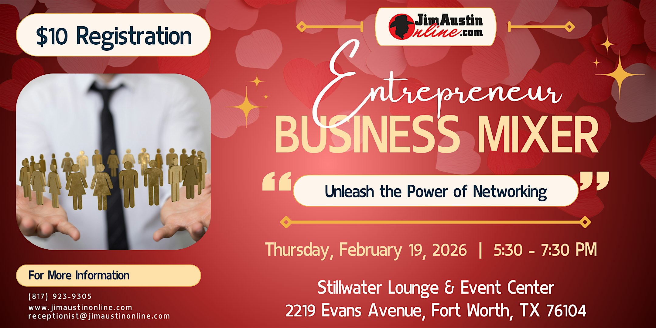 by admin12Feb JAO Entrepreneur Business Mixer – February 2026 at Stillwater Lounge & Event Center – Fort Worth, TX JAO Entrepreneur Business Mixer – February 2026 at Stillwater Lounge & Event Center – Fort Worth, TX 3 3 people viewed this event. Come network with fellow entrepreneurs, share ideas, and make valuable connections at our Entrepreneur Business Mixer! Tickets-RSVP Link Date And Time Thursday, February 19th, 2026 11:00 PM (PST) Venue Stillwater Lounge & Event Center Location 2219 Evans Avenue, Fort Worth, TX 76104 Event Category Fort WorthTexas Share With Friends Facebook Twitter Linkedin Xing Pinterest Share This Post: