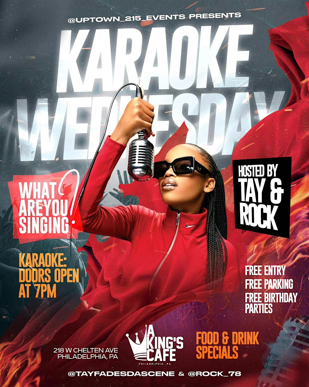 by admin12Feb Karaoke Wednesdays at A King’s Cafe – Philadelphia, PA Karaoke Wednesdays at A King’s Cafe – Philadelphia, PA 2 2 people viewed this event. Come checkout the Best Wednesday Night Event in Philly for Free! Free Entry, Free Parking & Free Birthday Parties! Tickets-RSVP Link Date And Time Thursday, February 19th, 2026 12:00 AM (PST) Venue A King’s Cafe Location 218 West Chelten Avenue, Philadelphia, PA 19144 Event Types Food & DrinkParty or Social Gathering Event Category PennsylvaniaPhiladelphia Share With Friends Facebook Twitter Linkedin Xing Pinterest Share This Post: