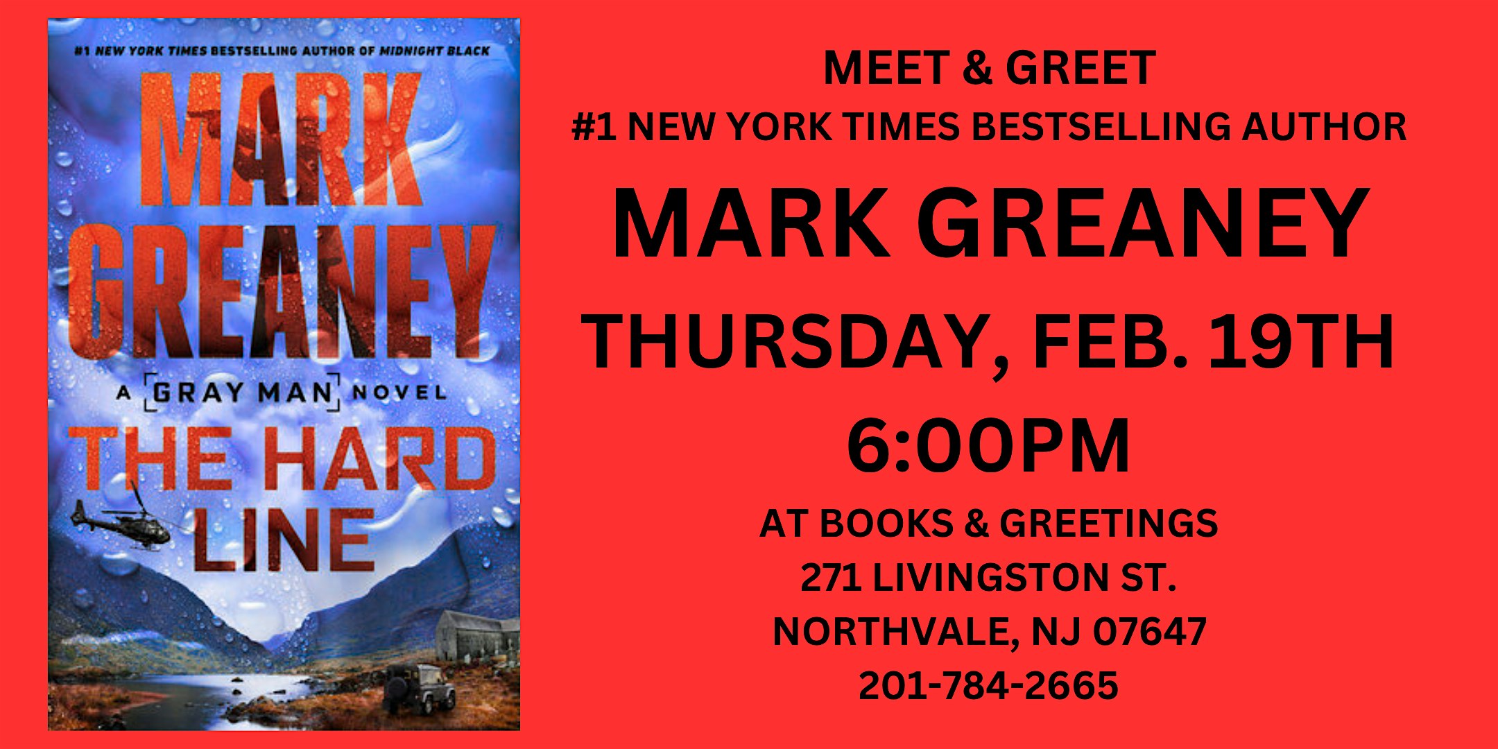 by admin12Feb Meet and Greet The Gray Man series Author Mark Greaney Thurs. Feb. 19th 6PM at Books & Greetings – Northvale, NJ Meet and Greet The Gray Man series Author Mark Greaney Thurs. Feb. 19th 6PM at Books & Greetings – Northvale, NJ 5 5 people viewed this event. Join us for a signing with Mark Greaney, the mastermind behind The Gray Man series. Tickets-RSVP Link Date And Time Thursday, February 19th, 2026 11:00 PM (PST) Venue Books & Greetings Location 271 Livingston Street, Northvale, NJ 7647 Event Category New Jersey Share With Friends Facebook Twitter Linkedin Xing Pinterest Share This Post: