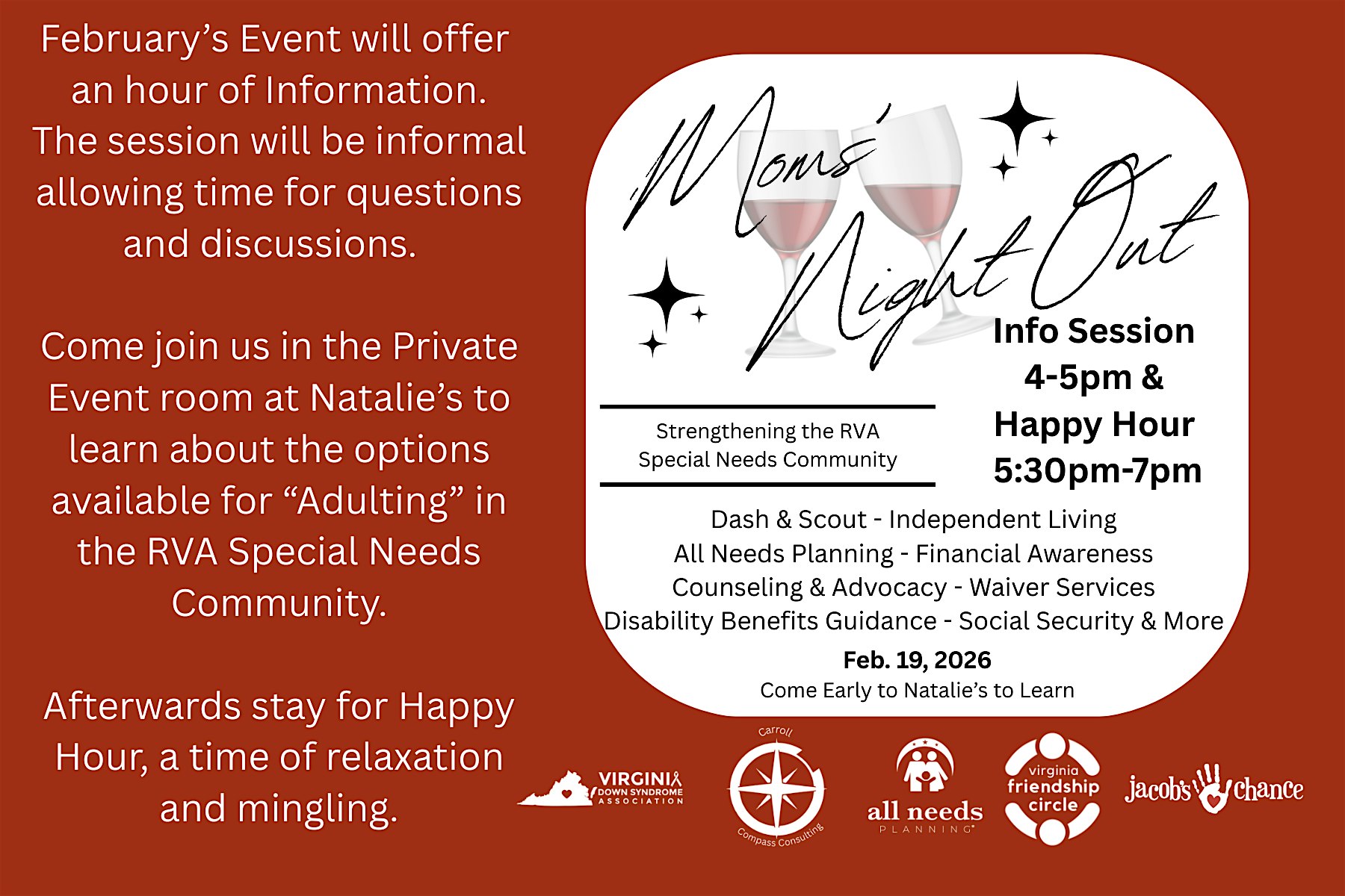 by admin12Feb Mom’s Night Out for the Special Needs Community at 2825 Hathaway Rd – Richmond, VA Mom’s Night Out for the Special Needs Community at 2825 Hathaway Rd – Richmond, VA 1 1 people viewed this event. Come meet other women who understand your journey. Learn how others manage busy lives and finding the resources to THRIVE. Tickets-RSVP Link Date And Time Thursday, February 19th, 2026 09:00 PM (PST) Venue 2825 Hathaway Rd Location 2825 Hathaway Road, Richmond, VA 23225 Event Types Community & CultureParty or Social Gathering Event Category Virginia Share With Friends Facebook Twitter Linkedin Xing Pinterest Share This Post: