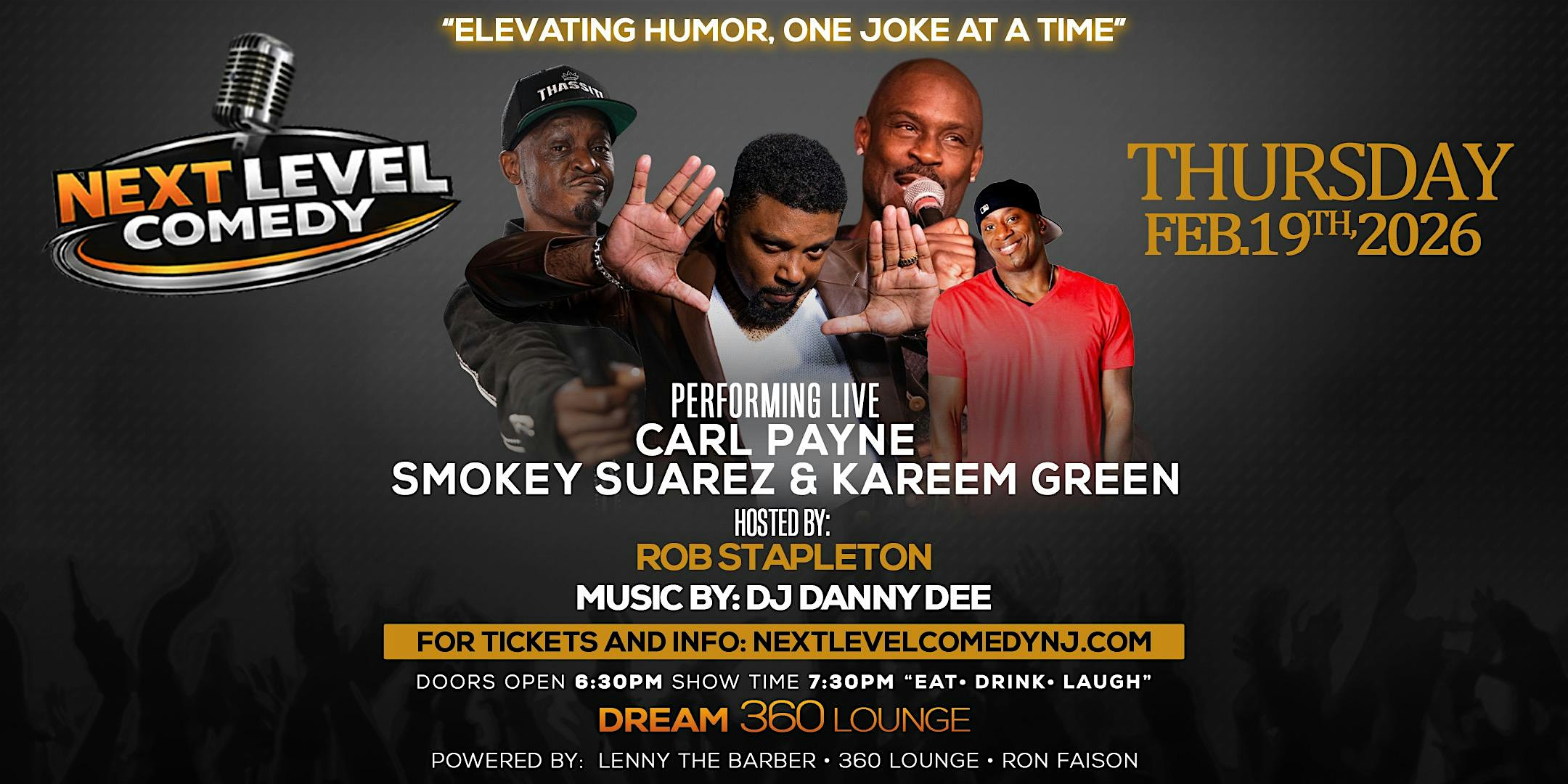 Next Level Comedy brings Carl Payne live with Smokey Suarez & Kareem Green at 360 Lounge @ American Dream Mall – East Rutherford, NJ