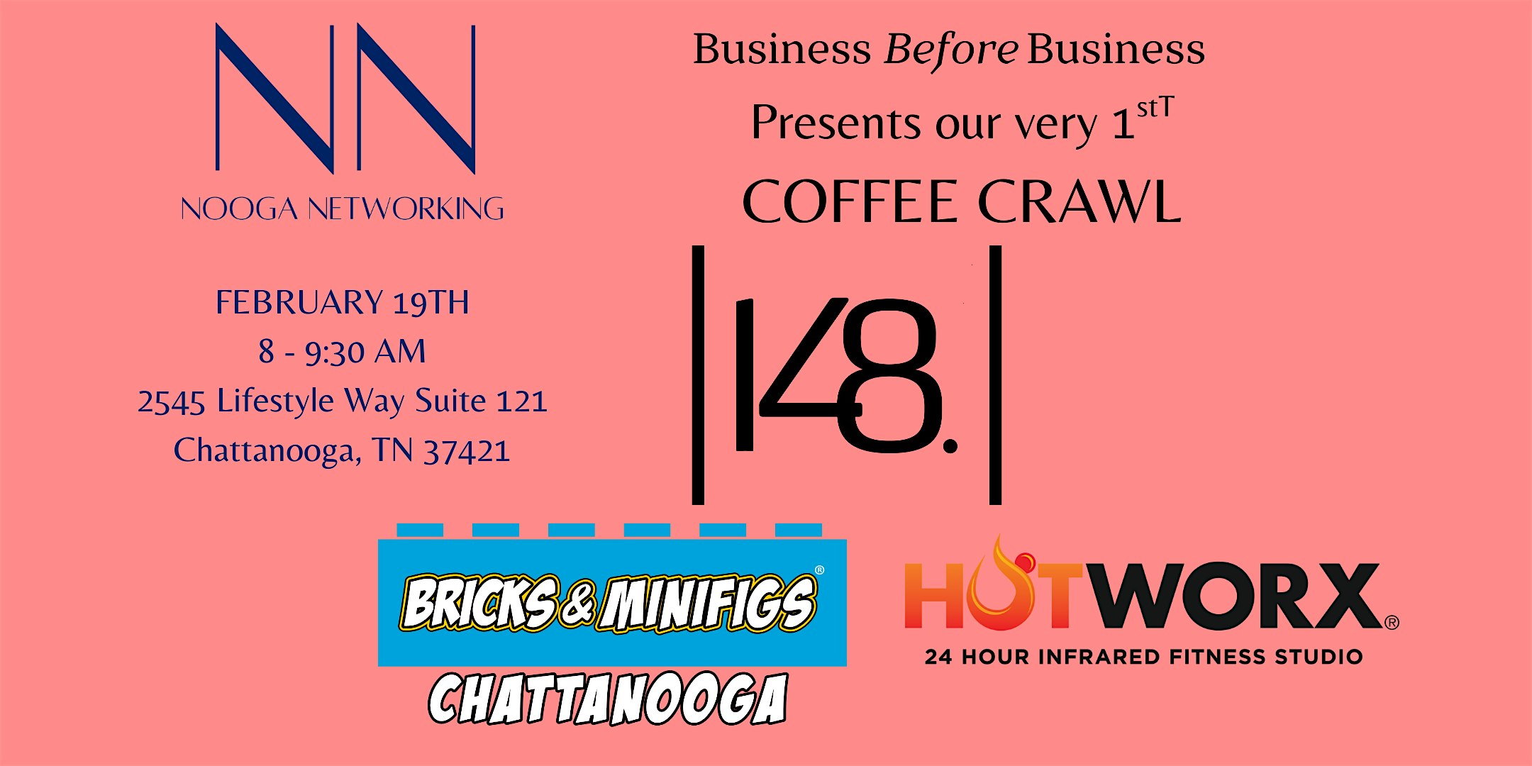 by admin12Feb Nooga Networking Coffee Crawl with 148 Films, Hotworx, and Bricks & Minifig at 148 Films. – Chattanooga, TN Nooga Networking Coffee Crawl with 148 Films, Hotworx, and Bricks & Minifig at 148 Films. – Chattanooga, TN 1 1 people viewed this event. Join Nooga Networking for our first ever Coffee Crawl. We will be meeting at 148 Films to kick off a Business Before Business with 3 venues! Tickets-RSVP Link Date And Time Thursday, February 19th, 2026 01:00 PM (PST) Venue 148 Films. Location 2545 Lifestyle Way, Chattanooga, TN 37421 Event Types Other Event Category ChattanoogaTennessee Share With Friends Facebook Twitter Linkedin Xing Pinterest Share This Post: