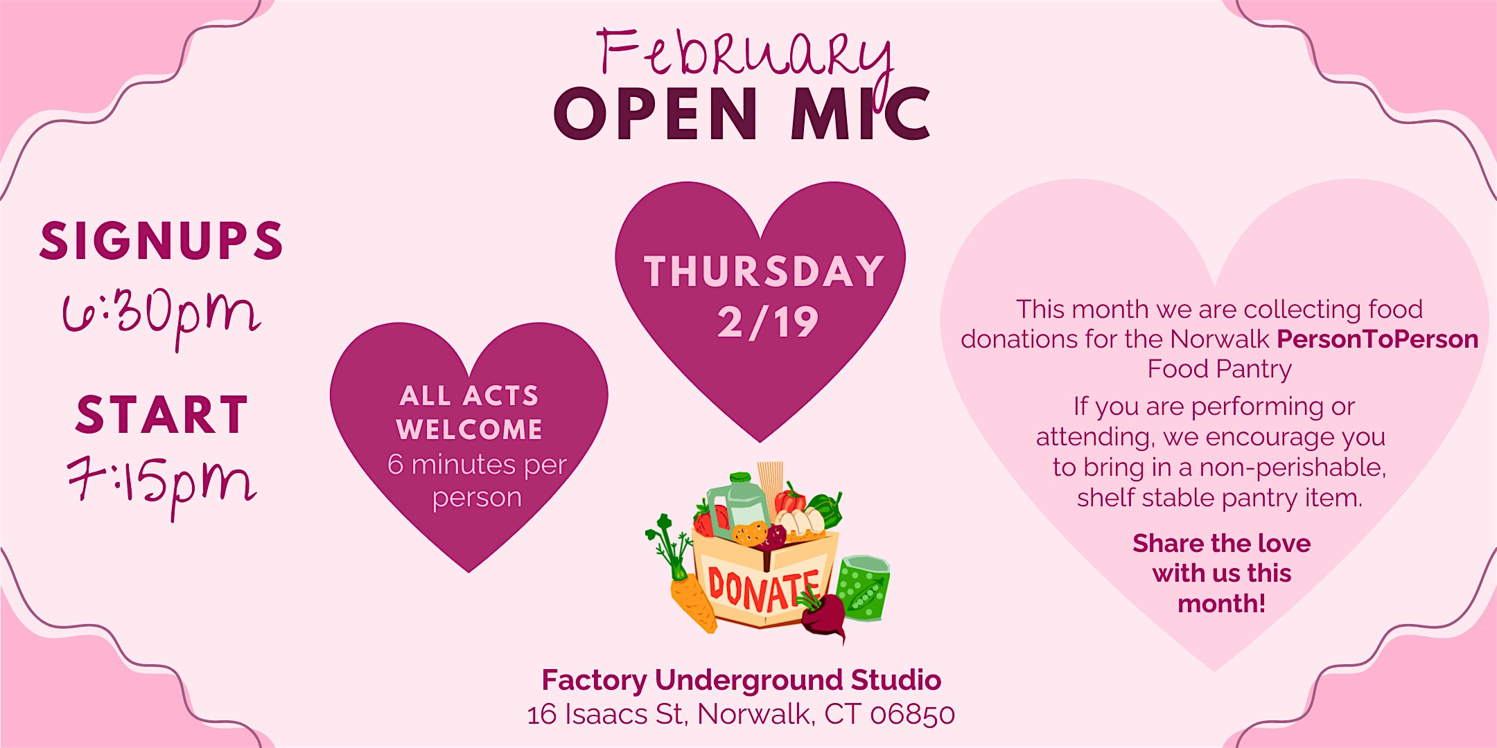 by admin12Feb Open Mic Food Drive at Factory Underground Studio at Factory Underground Studio – Norwalk, CT Open Mic Food Drive at Factory Underground Studio at Factory Underground Studio – Norwalk, CT 1 1 people viewed this event. Free Open Mic night at Factory Underground Studio in Norwalk, CT – All Acts welcome! Bring in a non-perishable food item to donate 🙂 Tickets-RSVP Link Date And Time Thursday, February 19th, 2026 11:00 PM (PST) Venue Factory Underground Studio Location 16 Isaacs Street, Norwalk, CT 6850 Event Types Concert or PerformancePerforming & Visual Arts Event Category BridgeportConnecticut Share With Friends Facebook Twitter Linkedin Xing Pinterest Share This Post: